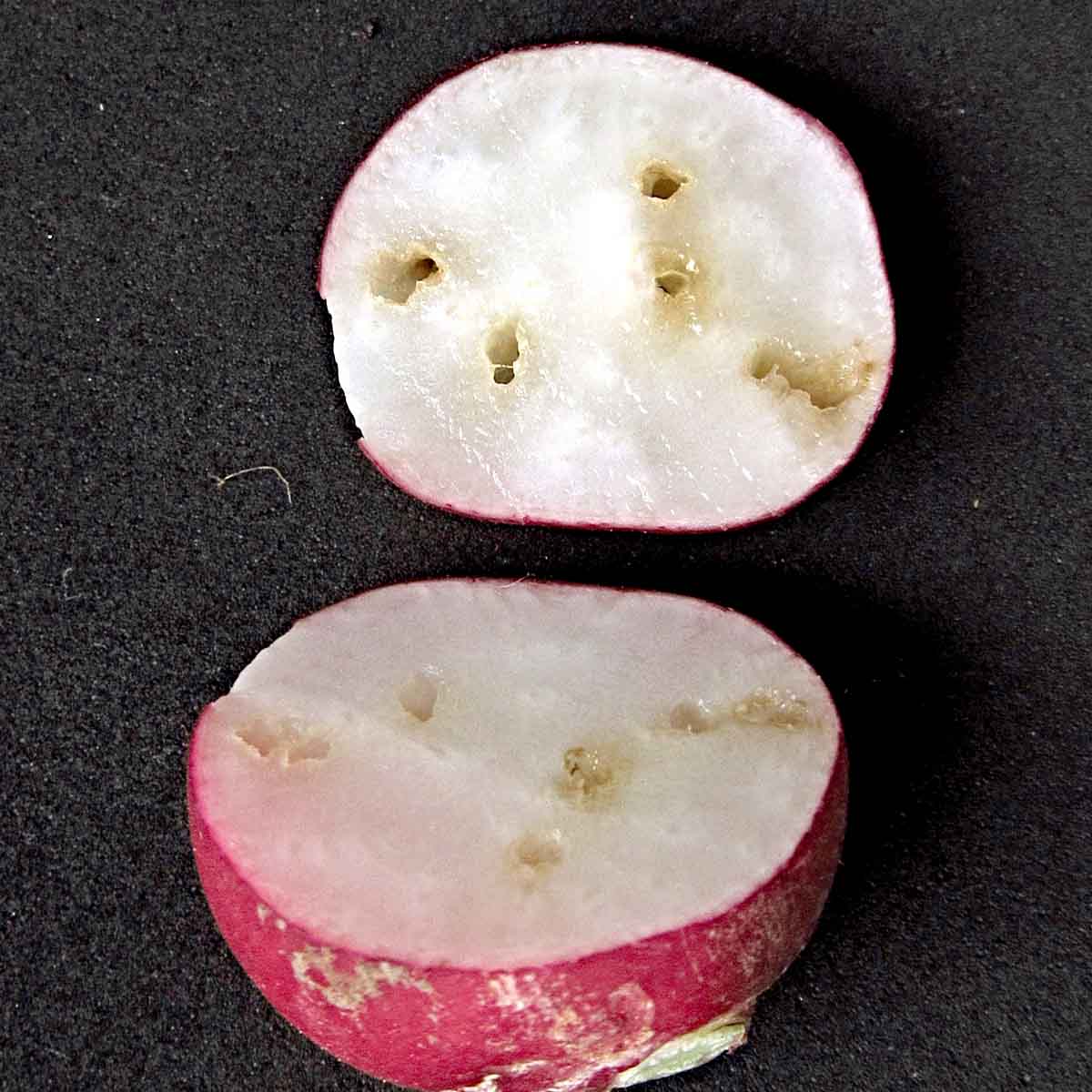 Ředkvička poškozená larvami květilky