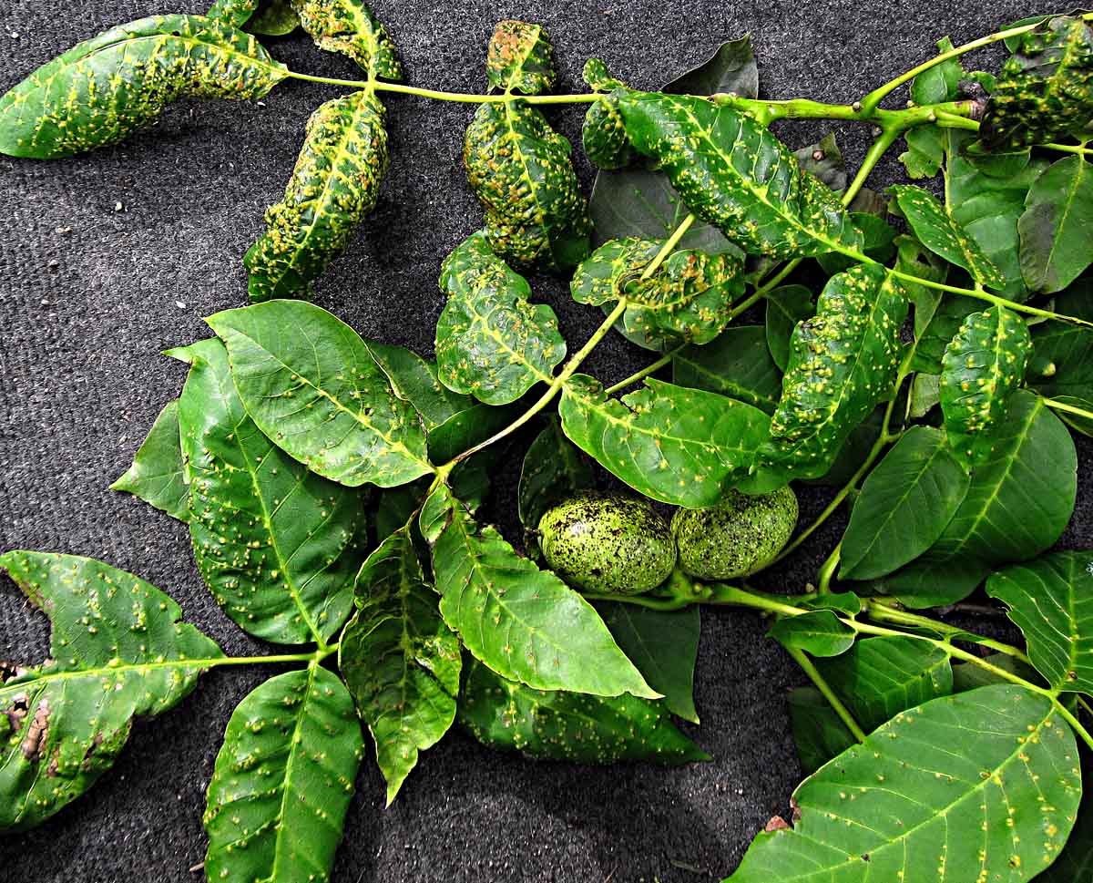 Někteří pěstitelé zaměňují tyto choroby s hálkami, které se v hojné míře na ořešácích také vyskytují. Způsobují je malí (spíše drobnohlední) roztoči - vlnovníci - vlnovník ořešákový a vlnovník puchýřovitý. První způsobuje plstnatost listů, druhý hrotnatou bradavičnatost na listech a vzácně i na rubině mladých plodů - na líci listů se během vegetace objevují vypouklé hálky, až bradavičnaté útvary. Hálky jsou ze spodní strany vyplněny hustou spletí trichomů (plstí) a uvnitř žijí roztoči. Mají několik překrývajících se generací v roce. Přezimují pod šupinami pupenů, nikoliv na listech, proto likvidace napadeného listí zde moc nepomůže. Roztoči (pokud se pravidelně silně nepřemnožují) však výraznější škody nezpůsobují. Proti vlnovníkům u nás zatím není povolen žádný ochranný přípravek. V době rašení můžeme proti vlnovníkům použít přípravek Ekol a případně také můžeme aplikovat biologický přípravek obsahující dravé roztoče Typhlodromus pyri.