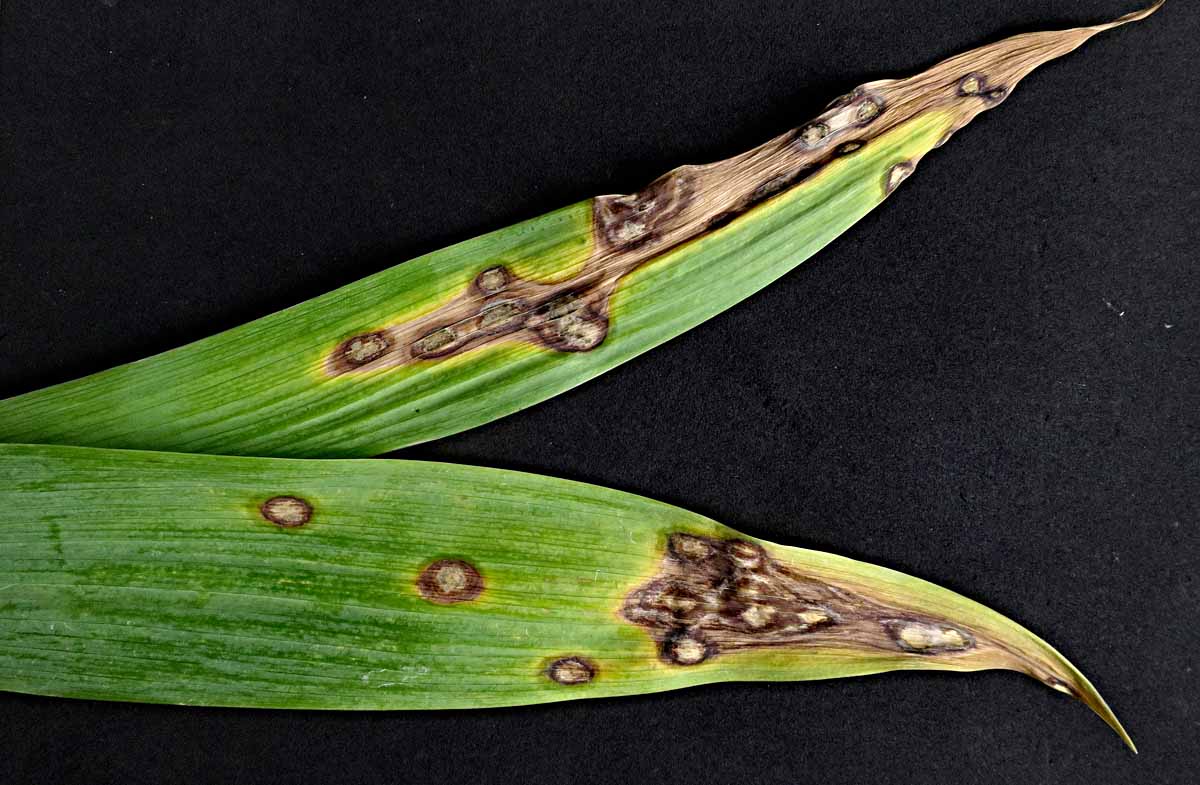 Nebezpečnou chorobou kosatců je skvrnitost listů kosatce (Davidiella macrospora). Za vysoce vnímavé jsou považovány Iris barbata a I. germanica, odolné se jeví I. sibirica a jeho hybridy. Hostiteli patogenu jsou i další druhy okrasných rostlin, např. Hemerocalis, Fresia, Narcissus a Gladiolus. Na jaře se objevují na listech drobné, prosvítající skvrnky s červeným okrajem. Později se skvrnky zvětšují a dostávají zřetelný tmavohnědý okraj. Skvrny se vyskytují hlavně na horní polovině listových čepelí. Za vlhka bývají pokryty černavým povlakem výtrusů. Při silném napadení listy se skvrnami postupně odumírají. Ochrana: Pro výsadby jsou vhodná slunná stanoviště, výskyt onemocnění podporuje deštivé počasí a závlaha rosiči. Napadení snižuje likvidace všech starých napadených listů, pravidelné přesazování rostlin (nejpozději po 3–4 letech), výsadba v dostatečné vzdálenosti umožňující rychlé osychání povrchu rostlin, pH vyšší než 6 a dostatečná zásoba živin, zejména fosforu a vápníku. Při objevení se skvrnitosti až během vegetace se provádí fungicidní ošetření od prvních symptomů. Ošetření opakujeme v intervalu 7 až 10 dnů, častěji za deštivého počasí. Při každoročním výskytu se rostliny ošetřují od počátku vegetace od výšky cca 15–20 cm opakovaně v 10–14denních intervalech. K ošetření lze použít fungicidy určené proti původcům listových skvrnitostí okrasných rostlin, např.: Discus, Dithane DG Neotec, Horizon 250 EW, Merpan 80 WG, Ortiva, Score 250 EC, Talent aj. K přípravkům je vhodné přidat smáčedlo a občas je střídat.
