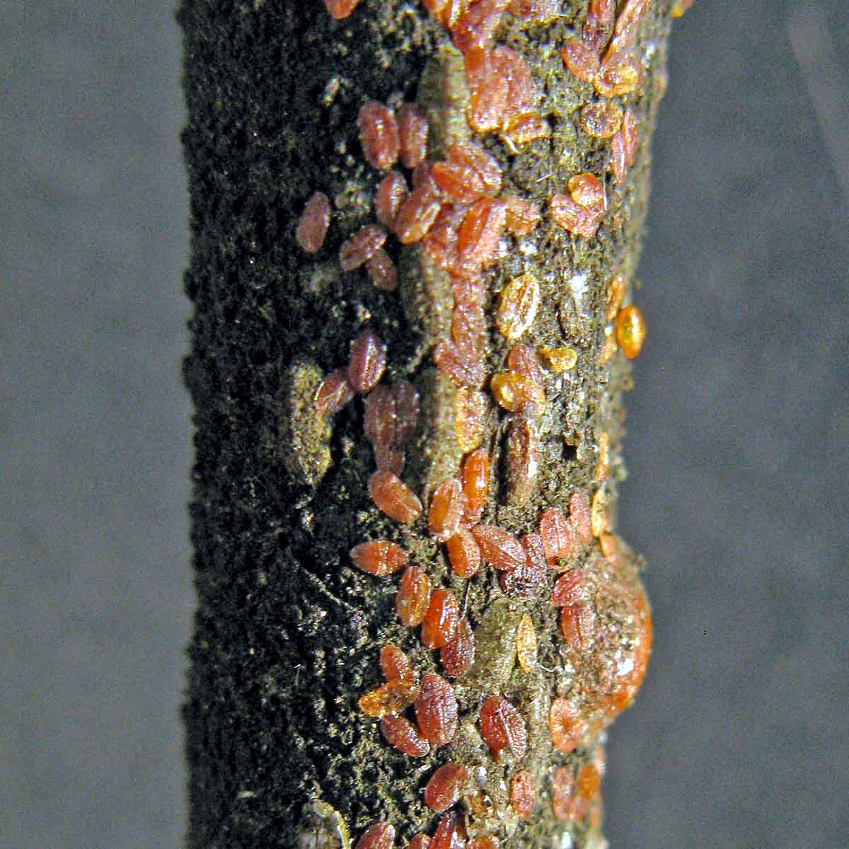 štítky jsou asi 4,7 mm velké, kruhovitého tvaru, červenohnědé až tmavohnědé barvy, někdy s bělavým popraškem; přezimují larvy asi 1,5–2 mm velké ve fázi 2. instaru |
