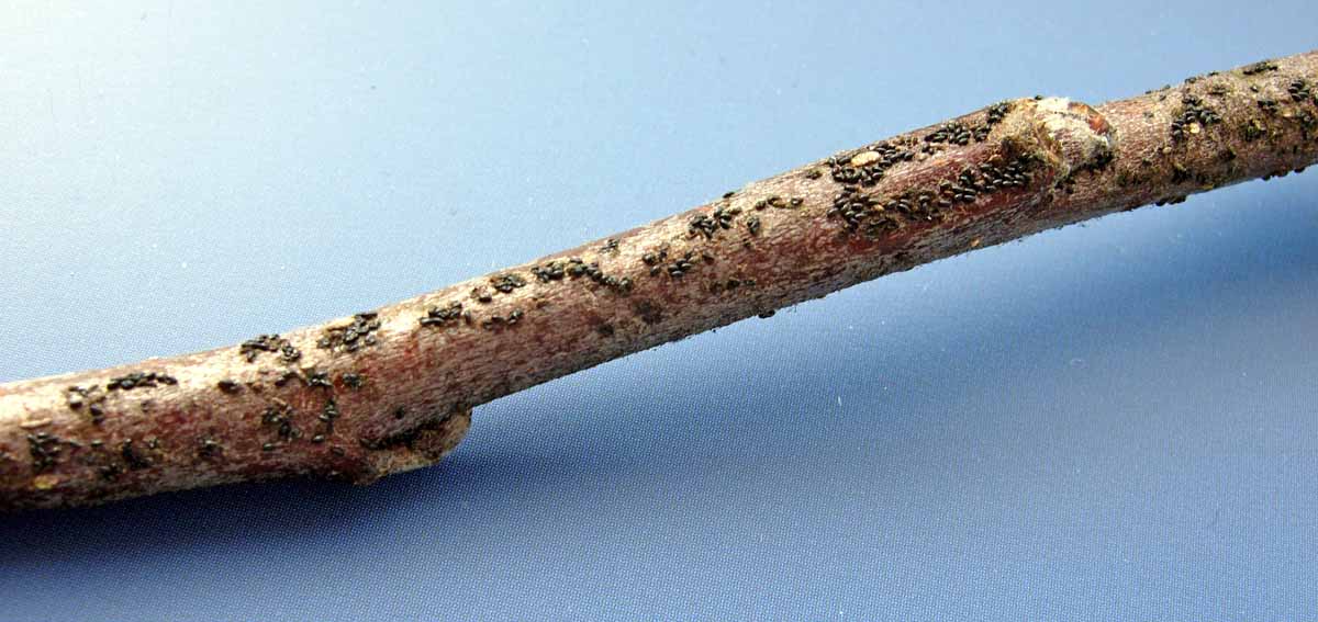 štítky jsou v průměru 1,5–2 mm velké, popelavě šedé, šedočerné až černé; pod kruhovitými, mírně vypouklými štítky přezimují larvy |