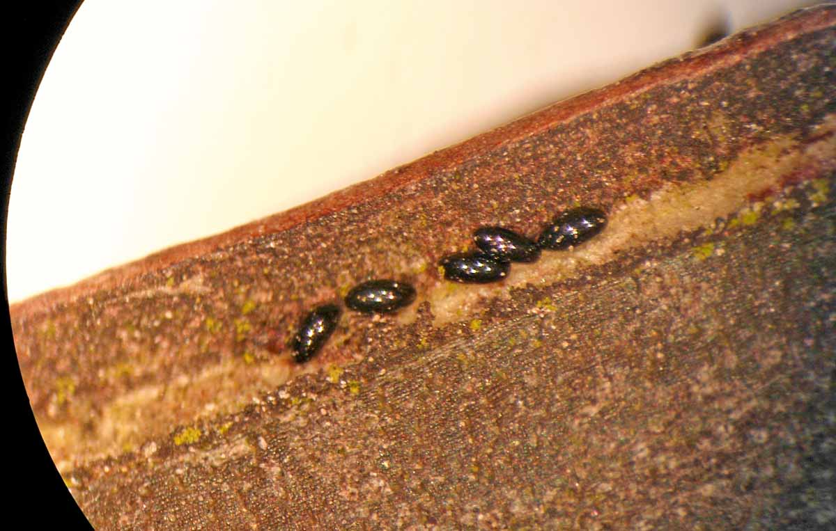 vajíčka jsou lesklá, vejčitá, asi 0,6 x 0,2 mm velká, černě zbarvená |