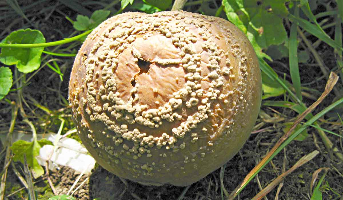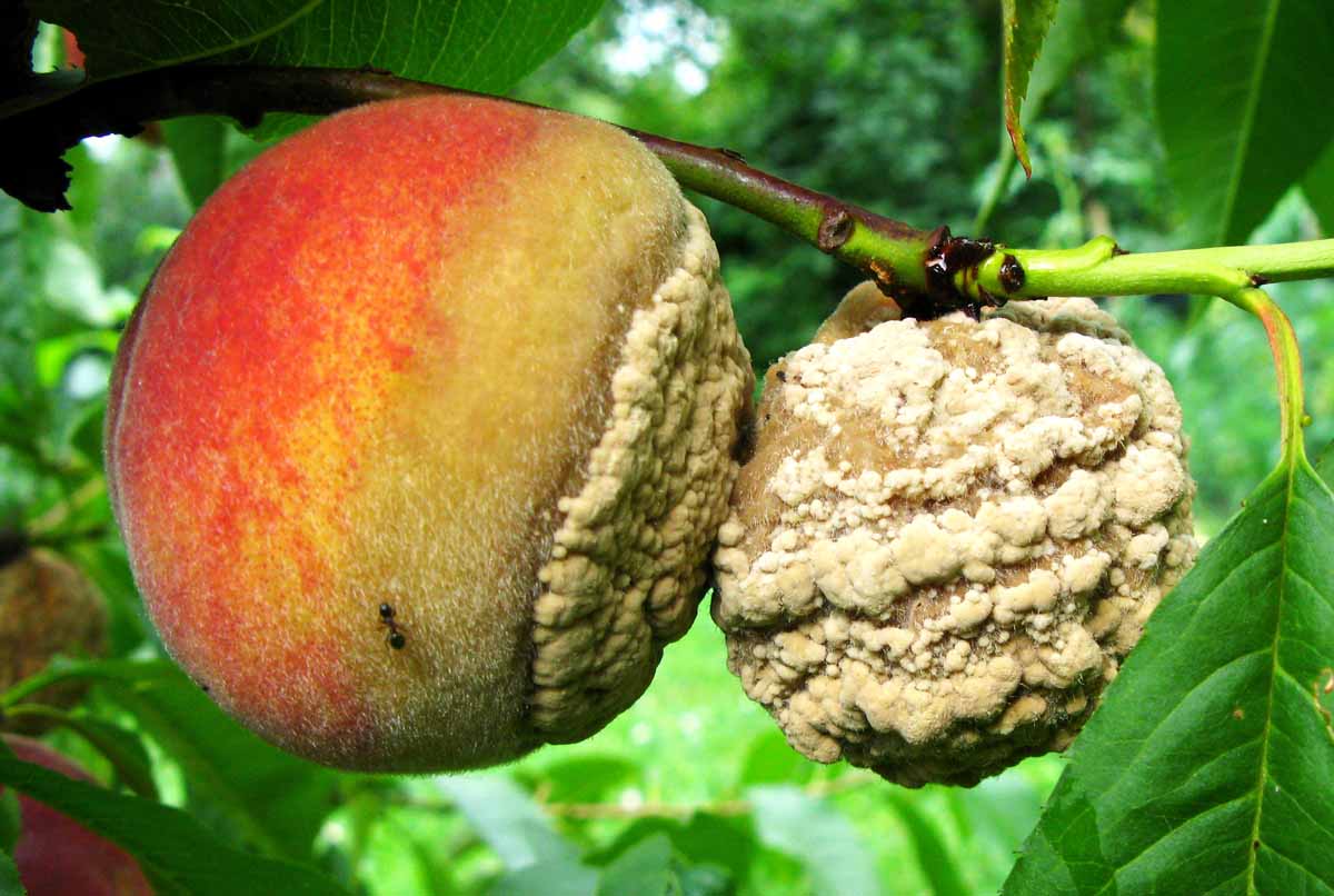Při deštivém období se zvyšuje riziko poškození dozrávajících plodů moniliniovou hnilobou. Původcem choroby je vřeckatá houba Monilinia laxa a někdy i její blízce příbuzná Monilinia fructigena. Houby lze od sebe rozlišit i makroskopicky - M. fructigena obvykle mívá na napadených plodech konidiofory s konidiemi uspořádány spíše v soustředných kruzích a napadá častěji jádrové ovoce, zatímco M. laxa je převážně patogenem peckovin a kupky konidií pokrývají napadenou část plodu roztroušeně. U peckovin jsou k chemické ochraně povoleny přípravky: Prolectus - ochranná lhůta (OL) 1 den; Moon Privilege, Teldor 500 SC - OL 3 dny; Signum, Zato 50 WG - OL 7 dnů; Talent - OL 14 dnů, u broskvoní: Luna Experience - OL 7 dnů a u slivoní: Abilis Ultra, Lynx - OL 7 dnů. Opatření jsou u peckovin i jádrovin obdobná. Především je třeba preventivně odstraňovat napadené plody a větévky(u peckovin), zabránit poranění plodů (efektivní je ochrana proti škůdcům) a v rizikových lokalitách omezit pěstování náchylných odrůd. U jádrovin lze moniliniovou hnilobu (a také sazovitost, mušincovitost a některé skládkové choroby) omezit, pokud provedeme pozdní ošetření před sklizní přípravky: Geoxe 50 WG - OL 3 dny, Pomax - OL 5 dnů, Bellis - OL 7 dnů, Flint Plus, Luna Experience, Moon Privilege - OL 14 dnů nebo pozdní ošetření proti strupovitosti některým z přípravků s kratší ochrannou lhůtou: Talent, Zato 50 WG - OL 14 dnů aj. Termín ošetření se řídí podle délky ochranné lhůty použitého fungicidu. Zdravotní stav plodů a skladovatelnost zlepšuje i přidání listových vápenatých hnojiv do postřiku. Pozor na ochrannou lhůtu u raných odrůd.