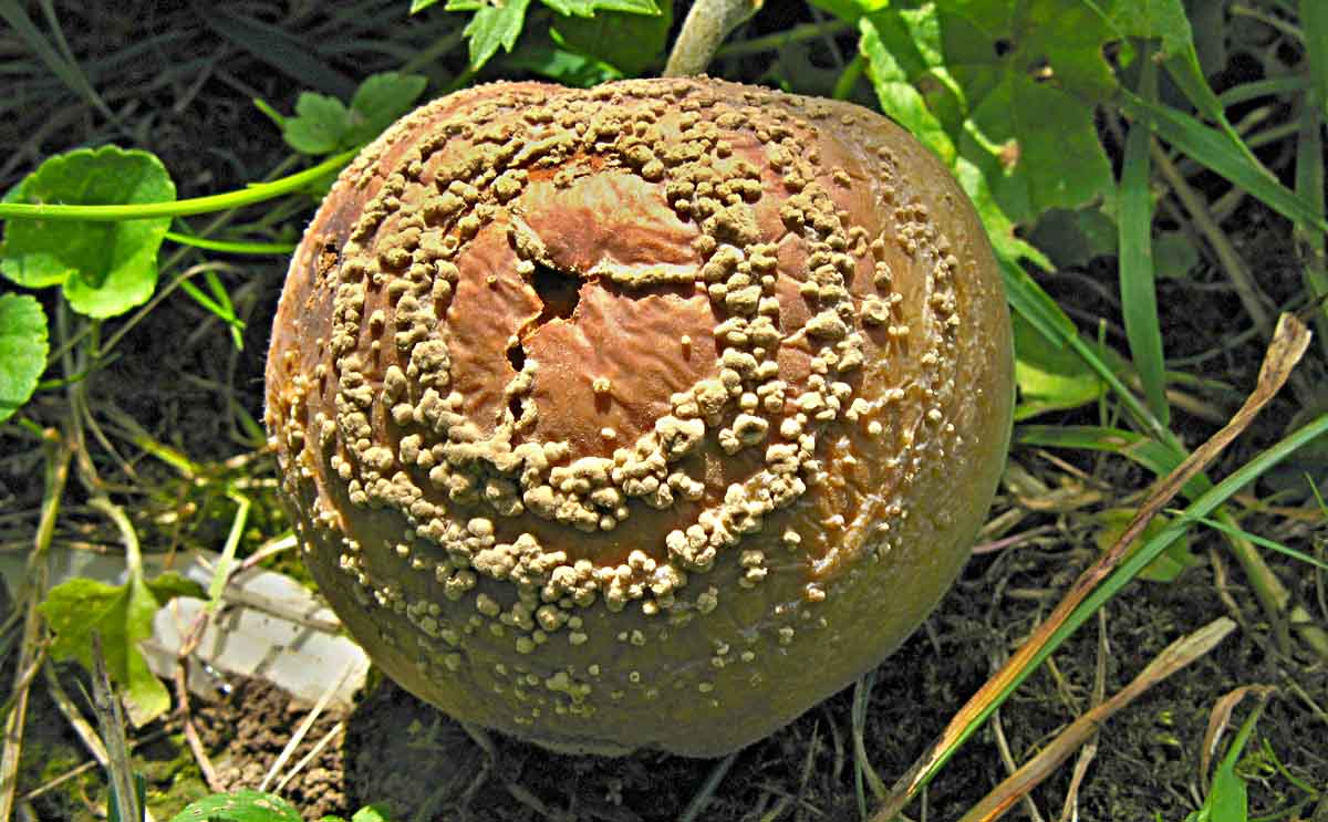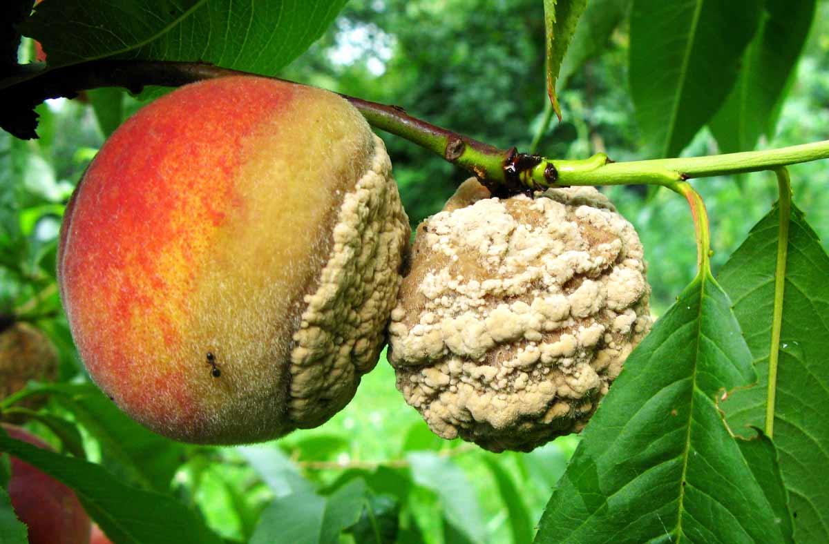 Při deštivém období se zvyšuje riziko poškození dozrávajících plodů moniliovou hnilobou. Původcem choroby je vřeckatá houba Monilinia laxa a někdy i její blízce příbuzná Monilinia fructigena. Houby lze od sebe rozlišit i makroskopicky - M. fructigena obvykle mívá na napadených plodech konidiofory s konidiemi uspořádány spíše v soustředných kruzích a napadá častěji jádrové ovoce, zatímco M. laxa je převážně patogenem peckovin a kupky konidií pokrývají napadenou část plodu roztroušeně.