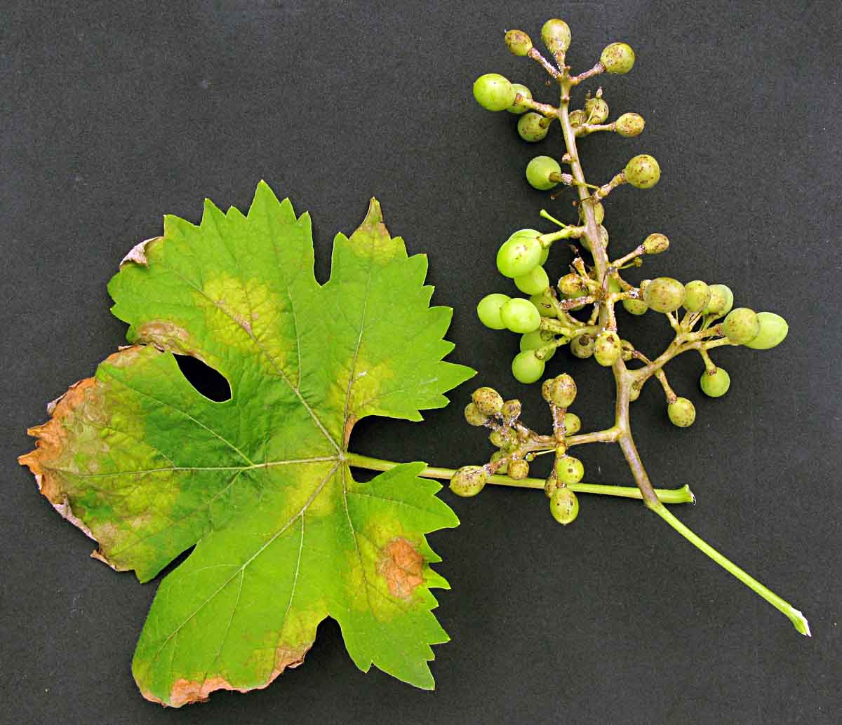 Plíseň révy (Plasmopara viticola) - Vzhledem k trvající citlivosti hroznů k napadení, až do fáze bobule velikosti hrachu, je vhodné pokračovat i v tomto období v ošetření rizikových porostů. Může docházet i k sekundárním infekcím. Od fáze bobule velikosti hrachu může dojít k napadení hroznů už jenom přes třapinu nebo stopečky bobulí. V období počátku zrání (zaměkání) končí vnímavost hroznů k napadení. Nadále však může docházet k infekcím listů. K významným primárním infekcím hroznů však již nemůže dojít. Nadále je třeba ošetřovat, zejména porosty s výskytem choroby a upřednostnit v tomto období kontaktně a preventivně působící fungicidy. Pro poslední ošetření proti plísni révy jsou vhodné především měďnaté fungicidy: Cuprocaffaro Mickro, Cuproxat SC, Defender, Flowbrix, Funguran-OH 50 WP, Champion 50 WP/WG, Kocide 2000, Kuprikol 50/250 SC aj. - nepřekročit stanovený limit množství mědi! Při rozhodování o termínu použití měďnatého fungicidu by mělo být zohledněno nejefektivnější využití jeho vysoké a dlouhodobé účinnosti k ochraně starých listů (ukončený růst) proti plísni révy a uplatnění vedlejšího vlivu na zpevnění pletiv, které může zlepšit i vyzrávání réví, a tak zvýšit odolnost vůči mrazu (pozdní použití). Současně mohou rezidua mědi také příznivě ovlivnit zdravotní stav, kvalitu vína a u modrých odrůd i vybarvení vína. Použít je možné i pomocné prostředky, např.: Alginure, Aqua Vitrin K aj.