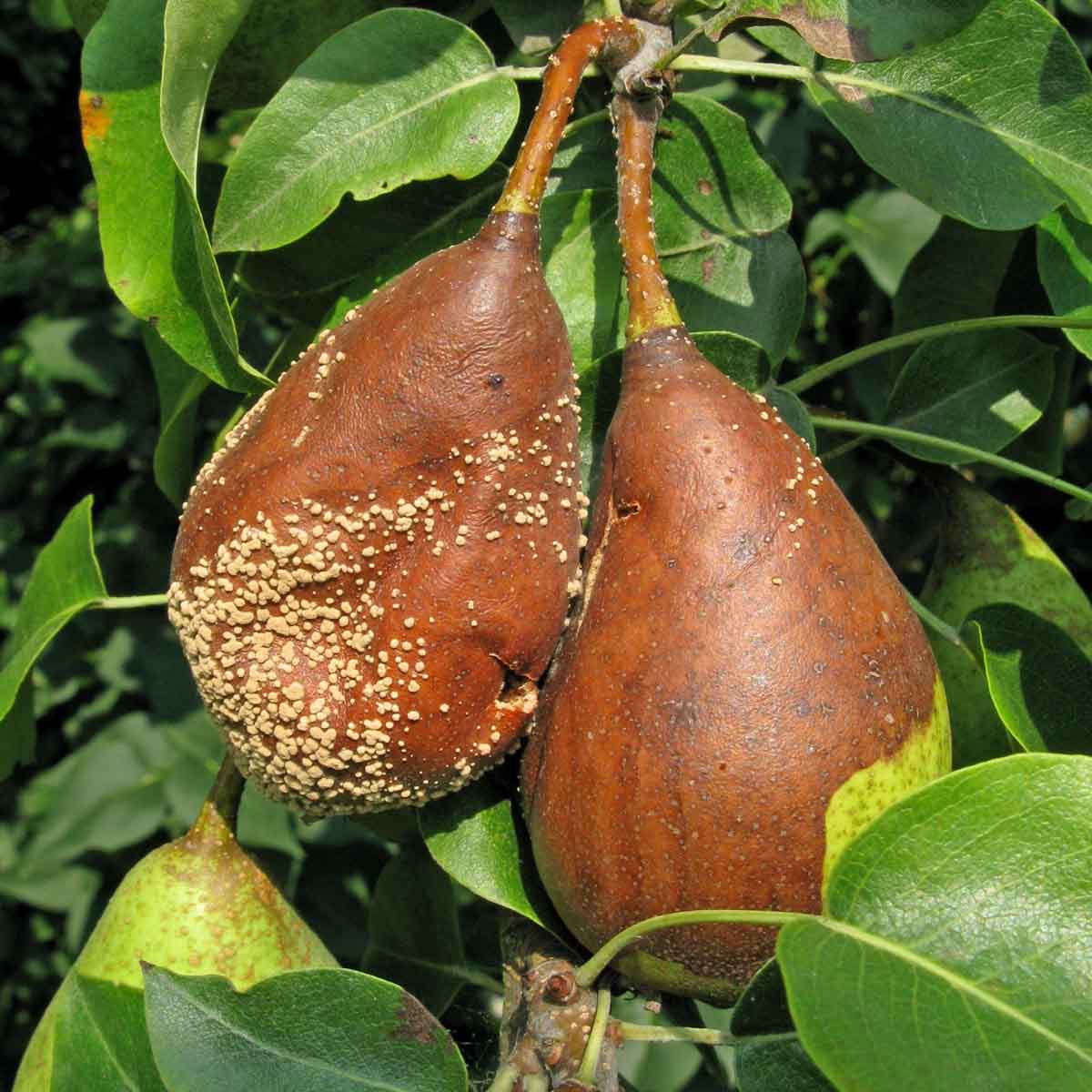 Při deštivém období se zvyšuje riziko poškození dozrávajících plodů peckovin i jádrovin moniliniovou hnilobou. Původcem choroby je vřeckatá houba Monilinia laxa a někdy i její blízce příbuzná Monilinia fructigena.