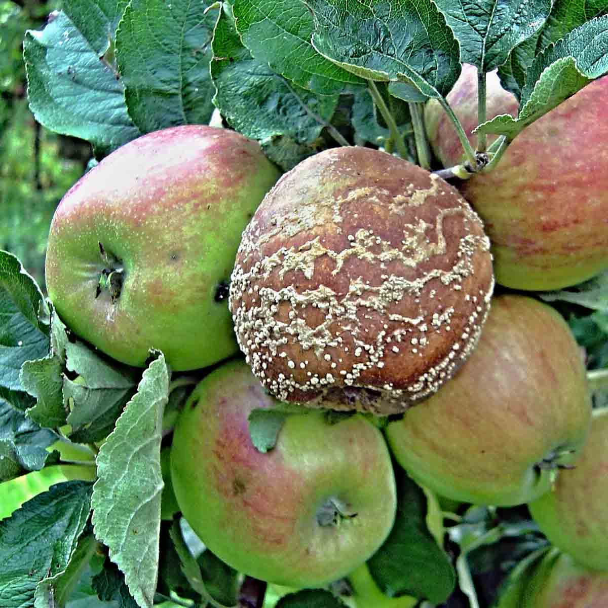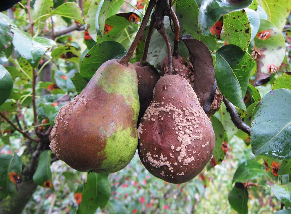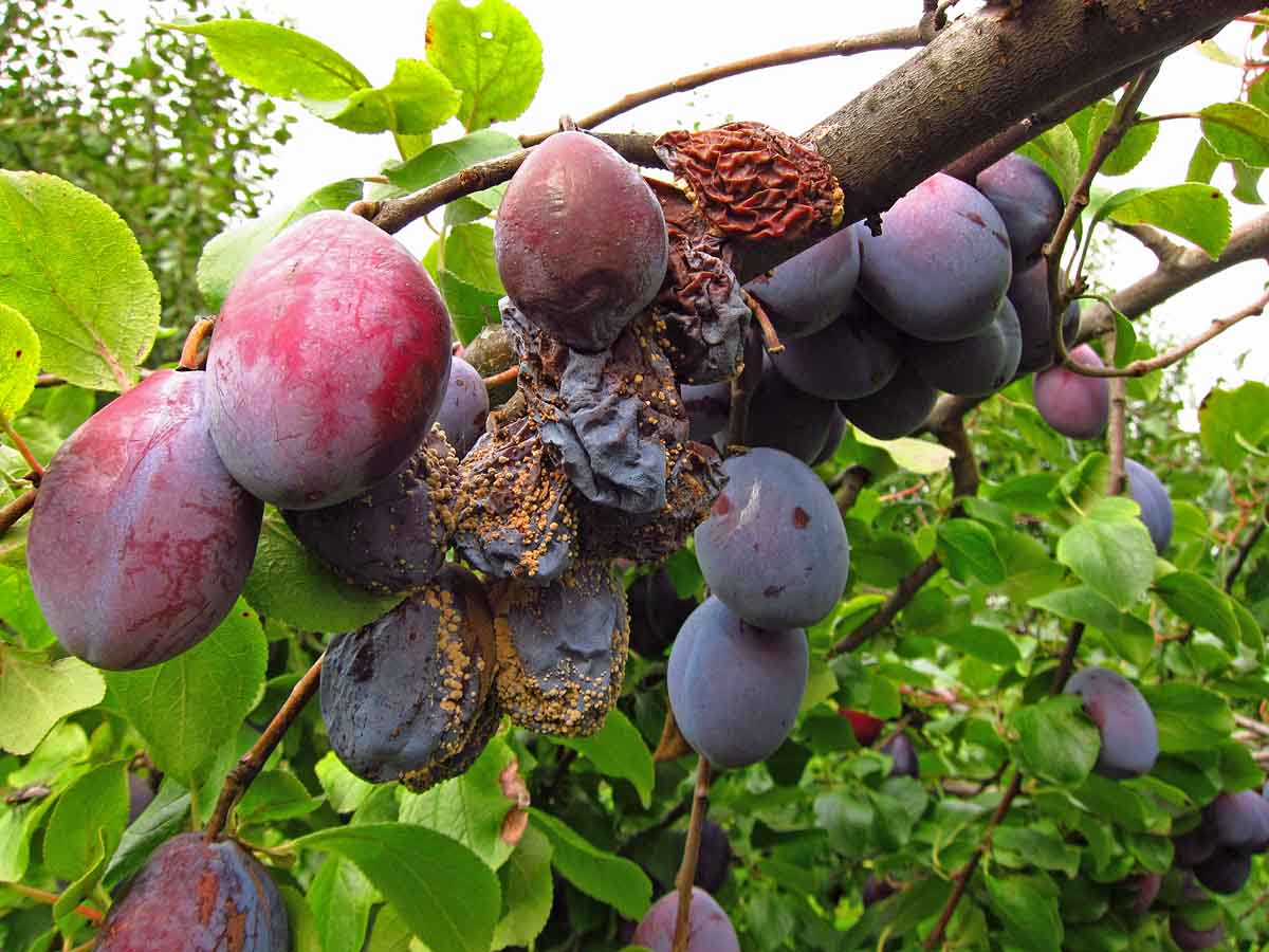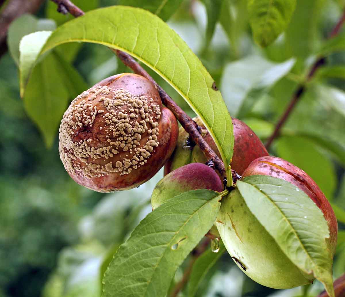 Při deštivém období se zvyšuje riziko poškození dozrávajících plodů peckovin i jádrovin moniliniovou hnilobou. Původcem choroby je vřeckatá houba Monilinia laxa a někdy i její blízce příbuzná Monilinia fructigena. Houby lze od sebe rozlišit i makroskopicky - M. fructigena mívá konidiofory s konidiemi uspořádány spíše v soustředných kruzích a napadá spíše jádrové ovoce, zatímco M. laxa je častěji patogenem peckovin a kupky konidií pokrývají roztroušeně celý plod.