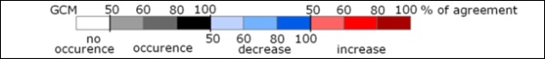 | Mapa: Změna klimatu - rok 2055, kombinace všech sedmi škůdců: červená barva - oblasti ohrožené novým výskytem škůdců nebo růstem počtu jejich generací, modrá barva - oblasti se snižováním počtu generací až vymizení druhů; šedá barva - škůdci oproti současnému stavu zachovávají svůj výskyt nezměněný, bílá barva - škůdci se nevyskytují; odstín barev značí shodu mezi pěti použitými scénáři změny klimatu (shoda 3, 4 nebo všech 5 scénářů). |