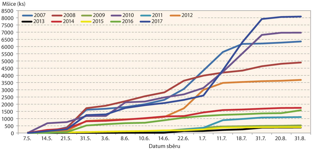 Graf 2: Nálet mšic na žlutou misku typu Lamberse na lokalitě Havlíčkův Brod - Občiny v letech 2007–2017