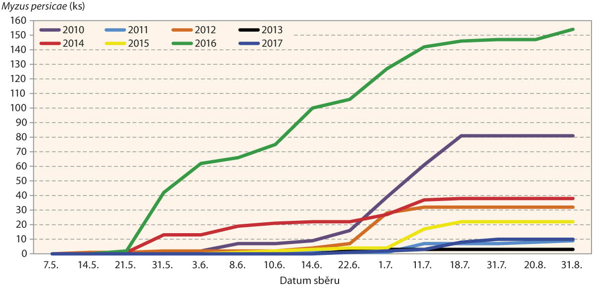 Graf 3: Nálet mšice broskvoňové (Myzus persicae) na žlutou misku typu Lamberse na lokalitě Havlíčkův Brod - Občiny v letech 2010–2017