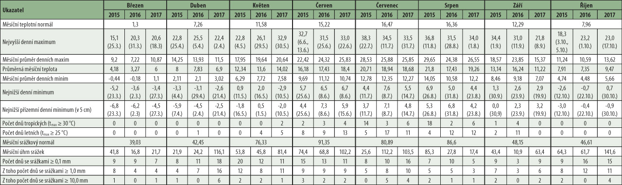 Tab.: Porovnání podrobnějších meteorologických charakteristik na lokalitě Valečov ve vegetaci v roce 2015, 2016 a 2017 (měřeno ve 2 m nad zemí)