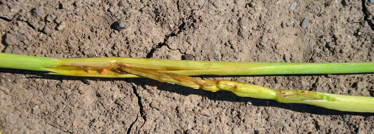Nepříjemným překvapením roku 2016 bylo silné napadení některých porostů jarního ječmene a ozimé pšenice bejlomorkou sedlovou (Haplodiplosis marginata). Bejlomorka napadla silně porosty jarního ječmene (obr. 12) a ozimé pšenice, zvláště na střední Moravě. Snad je dobré připomenout krátce bionomii škůdce - dospělci bejlomorky sedlové se líhnou z pupárií v půdě koncem května a začátkem června, hlavně v období teplého a vlhkého počasí. Dospělci jsou velcí 3 až 5 mm, samičky jsou obvykle větší. Obě pohlaví - samci i samičky mají červené zbarvení. Jsou to slabí letci a nedolétnou do velkých vzdáleností. Samičky kladou červená vajíčka na čepele listů ve skupinách - jakýsi řetízek a po 1 až 2 týdnech se líhnou larvy, které mají rovněž červené zbarvení a zalézají za listové pochvy prvního a druhého internodia. Zde intenzivně sají a působí tvorbu sedlovitých hálek (obr. 13), které oslabují stéblo. Dospělé larvy jsou až krvavě červené velikosti 4–5 mm a zalézají v červenci do půdy, kde mohou přežívat i dvě zimy jako živé nezakuklené larvy. Obvykle se však následující jaro kuklí v půdě, přičemž kuklení trvá několik dnů. V roce se vyskytuje jedna generace škůdce. Oslabená stébla neumožňují plný vývin klasů, snižuje se hmotnost tisíce zrn a stébla jsou oslabena i mechanicky. Může docházet i ke zkracování stébla - porost je jakoby „zubatý“, nevyrovnaný. Největší škody jsou při napadení na počátku sloupkování. Prognóza výskytu bejlomorky je obtížná s ohledem na možnost „přeležování“ larev v půdě.