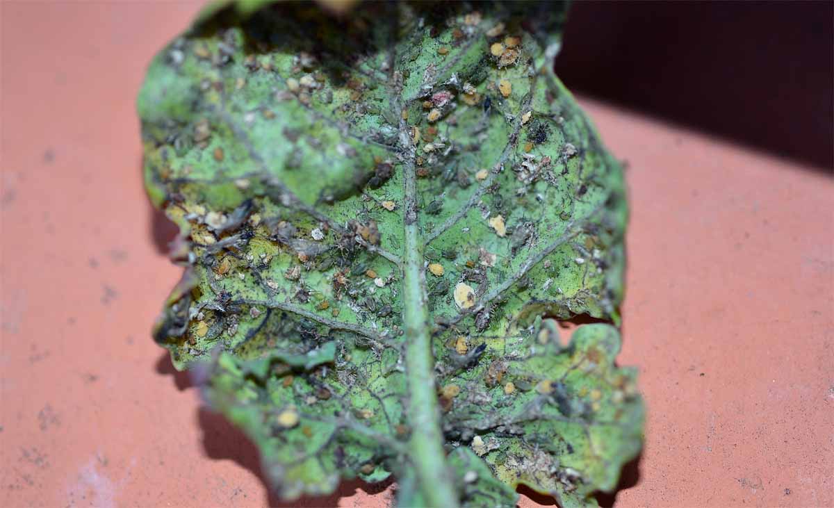 Obr. 15: Kolonie mšice broskvoňové na rubu listu ozimé řepky