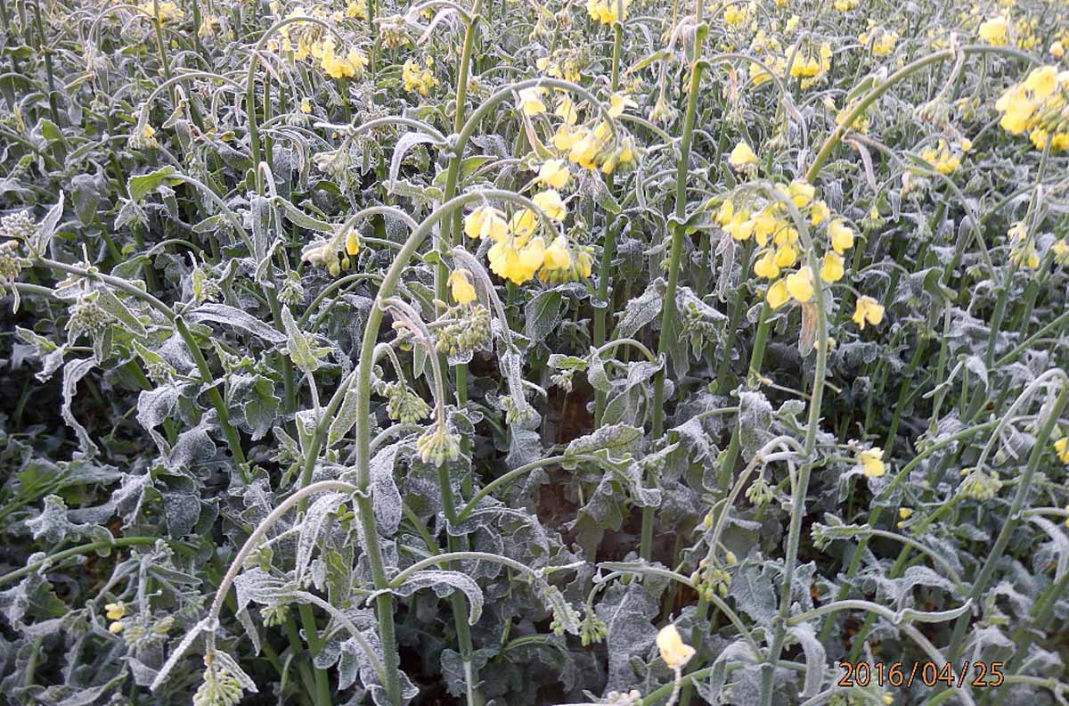 Obr. 2: Kvetoucí porost řepky poškozený mrazem