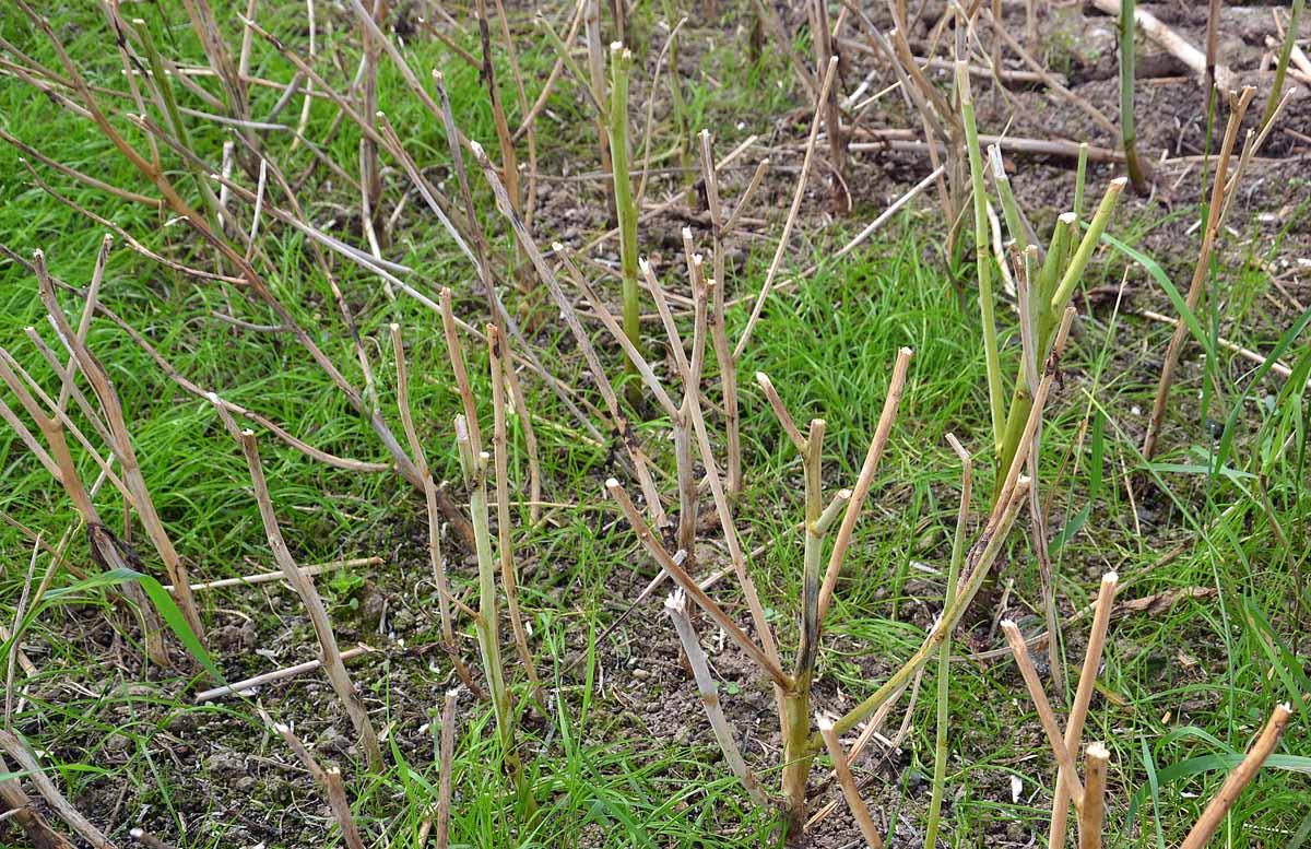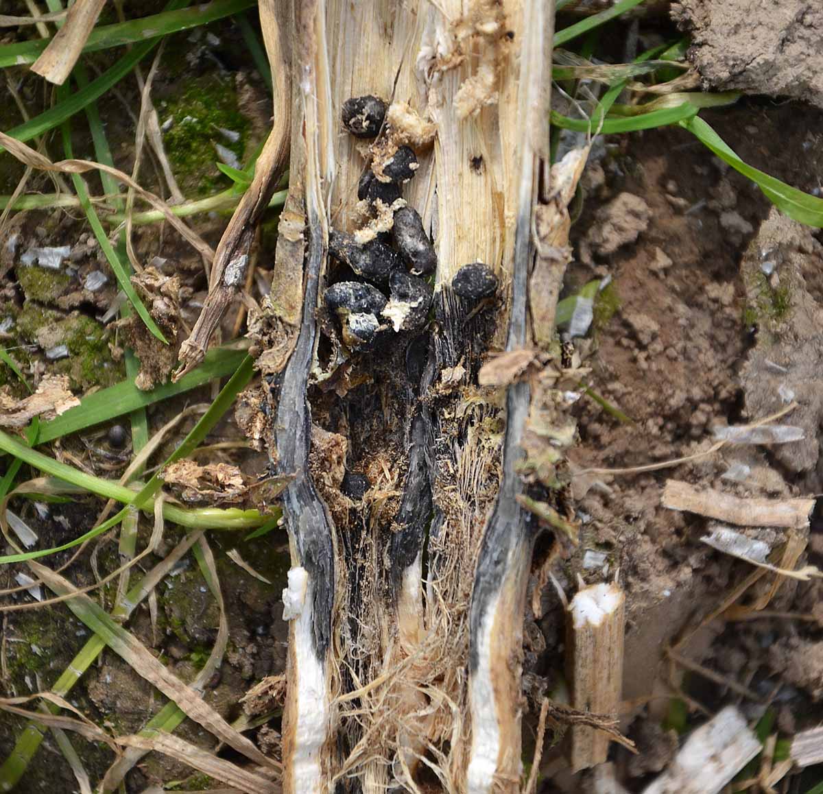 Na řepce ozimé to byl lokálně až kalamitní výskyt hlízenky obecné (Sclerotinia sclerotiourm), popř. další houby působící předčasné dozrávání řepky Verticillium longisporum. Výskyt těchto dvou patogenů zřejmě výrazně přispěl ke snížení výnosů řepky. Na některých lokalitách bylo po sklizni na strništi pozorováno napadení až 80 % (obr. 8). Na tomto obrázku je zřetelné napadení stonků výše nad povrchem půdy, popřípadě napadení větví rostlin. Po podélném rozřezání napadených stonků lze v hojné míře nalézt známá sklerocia houby (obr. 9).
