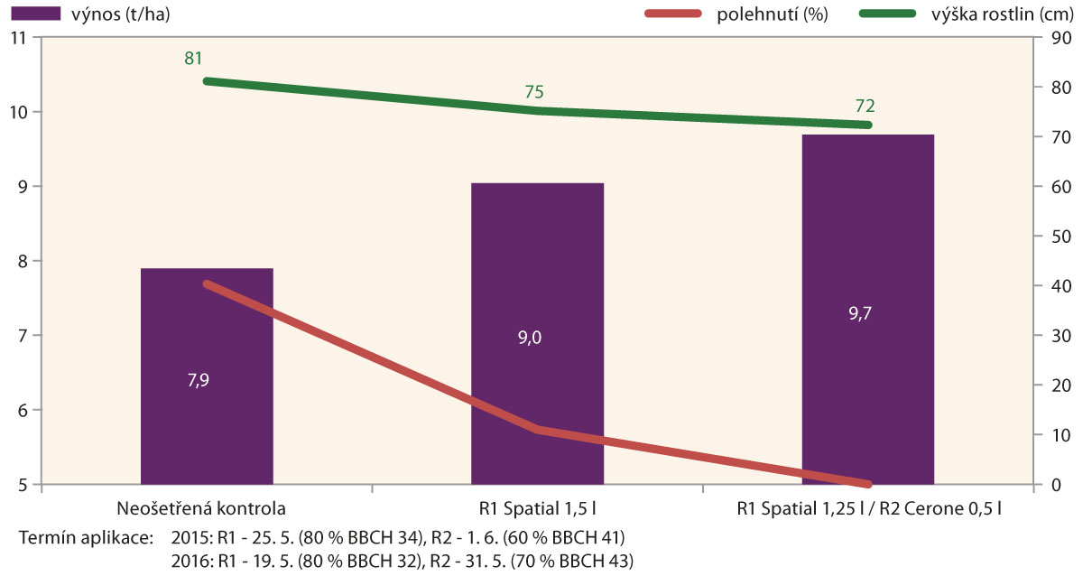 K ochraně porostu jarního ječmene proti poléhání lze přistoupit již na začátku sloupkování použitím dvousložkového regulátoru růstu Spatial Plus. Tento kombinovaný přípravek obsahuje dvě účinné látky navzájem se doplňující ve způsobu účinku - ethephon a chlomequat chloride. Zpevňuje a zkracuje stébla v průběhu sloupkování a zvyšuje tak jejich odolnost proti poléhání. Kromě toho při aplikaci v ranější růstové fázi zpevňuje báze rostlin a podporuje kořenový systém. Ječmen jarní se ošetřuje dávkou v rozmezí 1,0–1,5 l/ha v průběhu sloupkování (BBCH 32–37). Dávku je třeba upravit podle aktuálního stavu. Vyšší dávku použijeme u náchylných odrůd k poléhání a především v silných, dobře odnožených porostech. Samostatná aplikace tohoto typu regulátoru je přesto vhodnější při nižším riziku polehnutí. Při vyšším riziku polehnutí a v intenzivních technologiích pěstování lze použít také systém regulace: 1,0–1,25 l/ha Spatial Plus od fáze 2. kolénka (BBCH 32) a následně 0,3–0,5 l/ha Cerone 480 SL v pozdější růstové fázi (BBCH 39–45). Dlouhodobě tento sled poskytuje spolehlivou ochranu proti polehnutí a přínos v podobě navýšení výnosu.