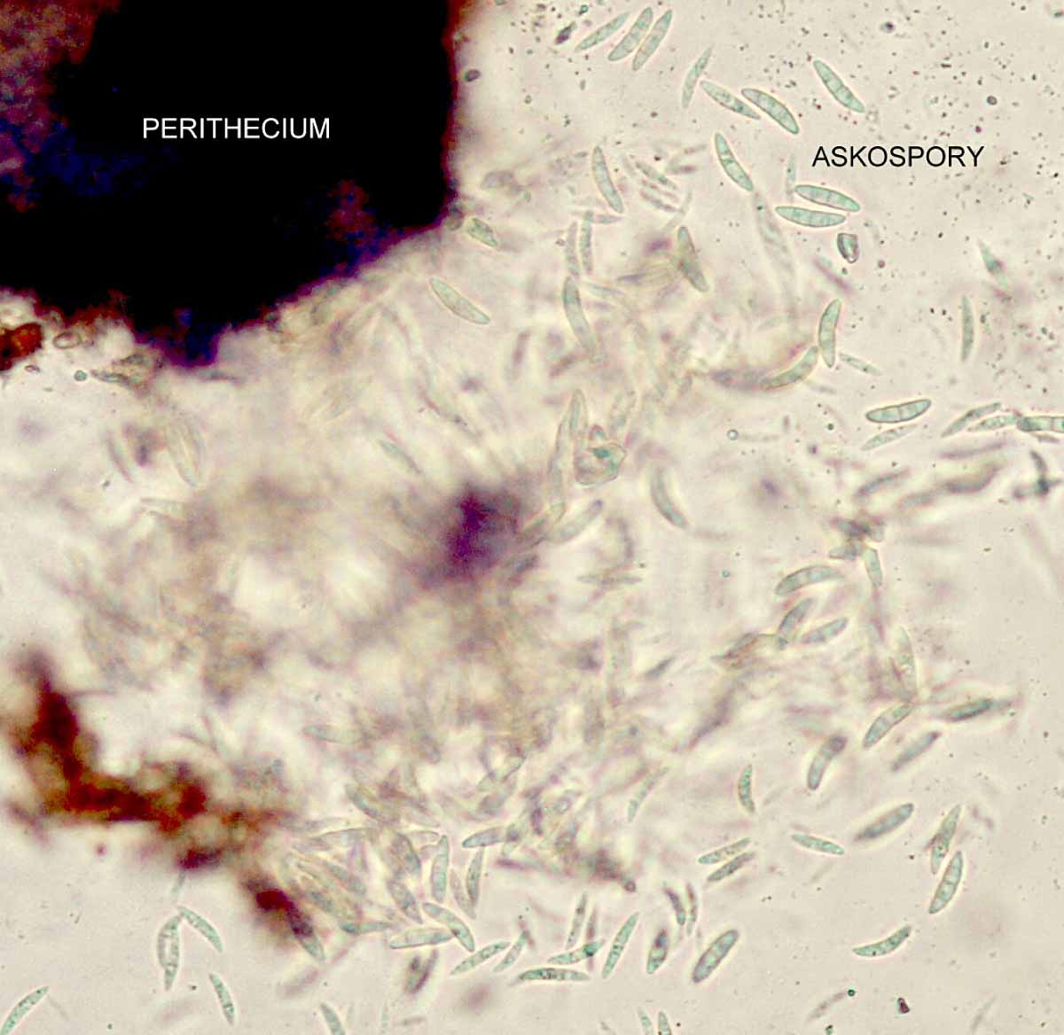 Obr. 4: Zralé askospory uvolněné z perithecia
