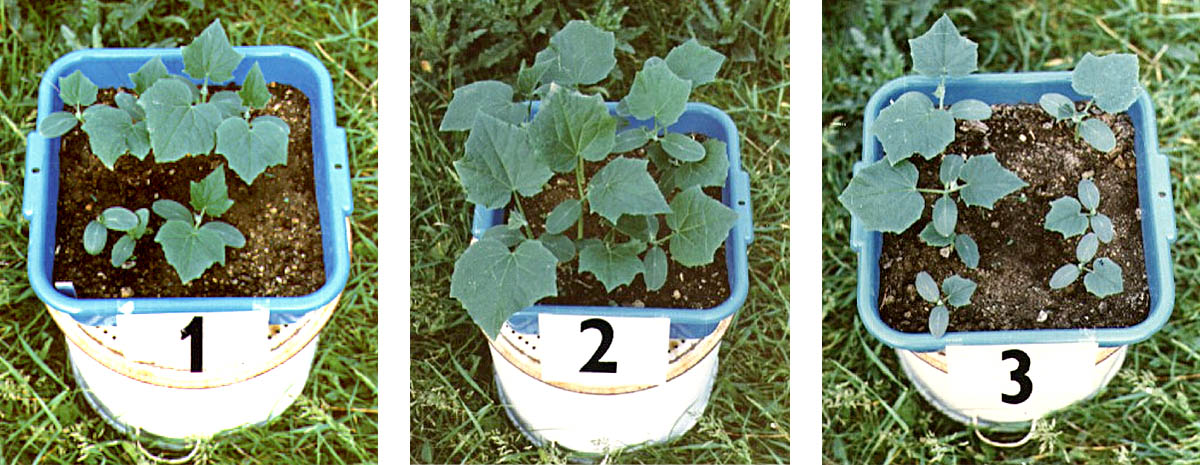Ze zelenin bylo ošetřeno osivo okurek suspenzí spor houby Trichoderma harzianum. Tento pokus dokládá, že se možnostem využití biologické ochrany nevěnujeme jen v několika posledních letech. Fotografie asi nebyly nikdy v této podobě publikovány, ale jde o snímky z roku 1986 nebo 1987 a dostatečně dokazují stimulační vliv ošetření (obr. 4).