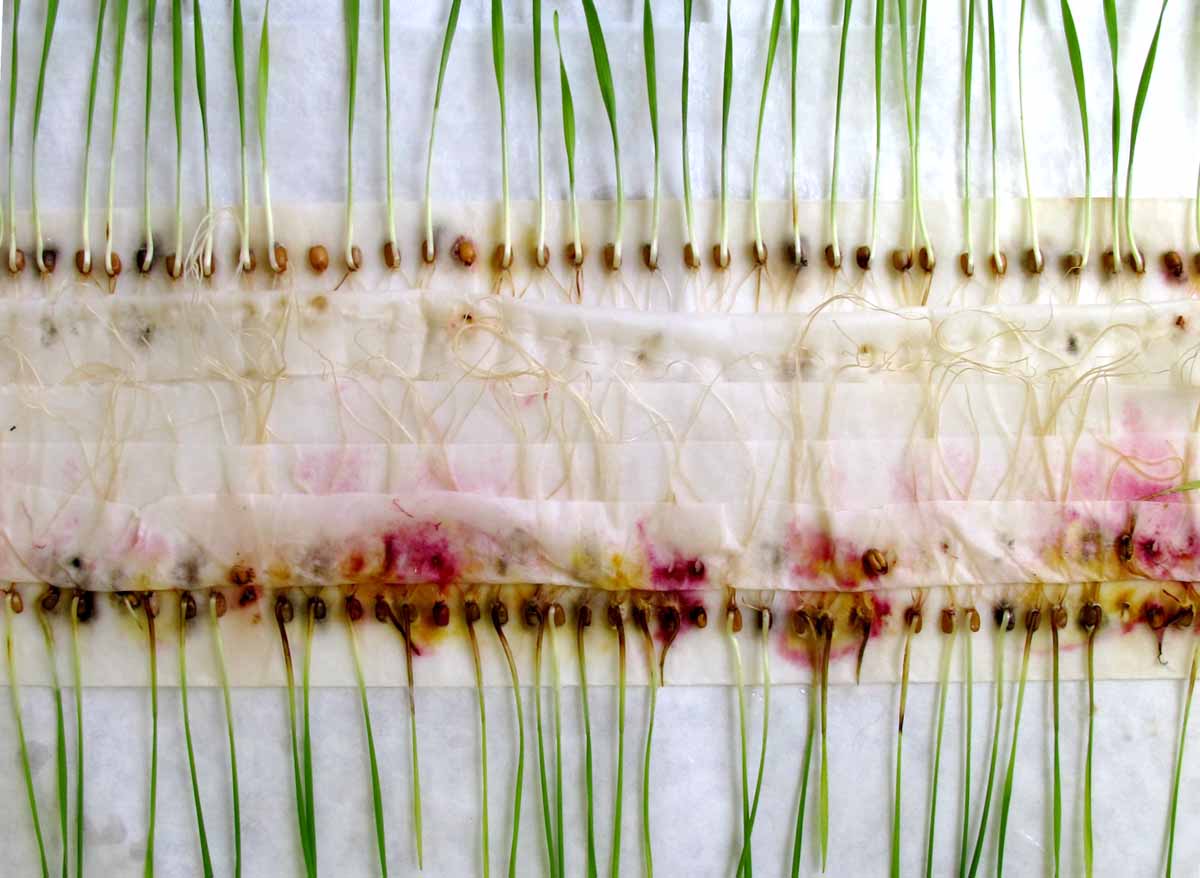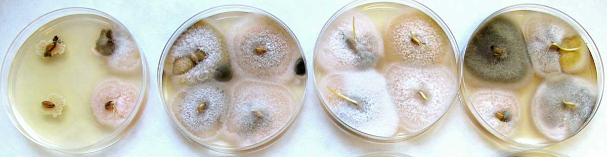 Obr. 1: Ukázka antifungálního účinku 0,1% roztoku oleje z anýzu na potlačení infekce fuzárii (F. culmorum) na osivu pocházejícím z napadených rostlin ozimé pšenice pěstované v laboratorním experimentu; vlevo ošetřeno, vpravo kontrola (voda)