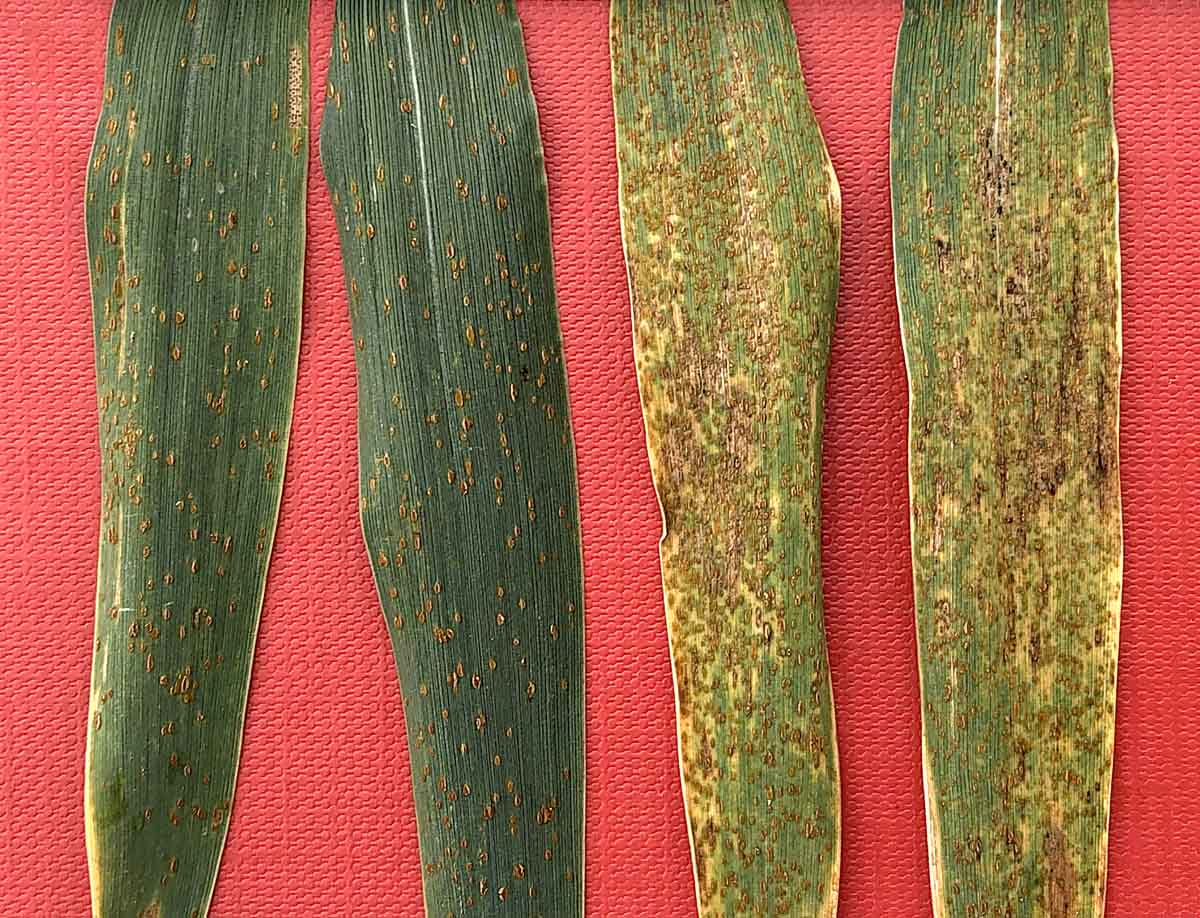 Obr. 4: Listy ozimé pšenice (Tobak) ošetřené kombinací Serenade ASO + Mero (vlevo) a kontrolní, neošetřené listy (vpravo) ve fázi růstu časné mléčné zralosti