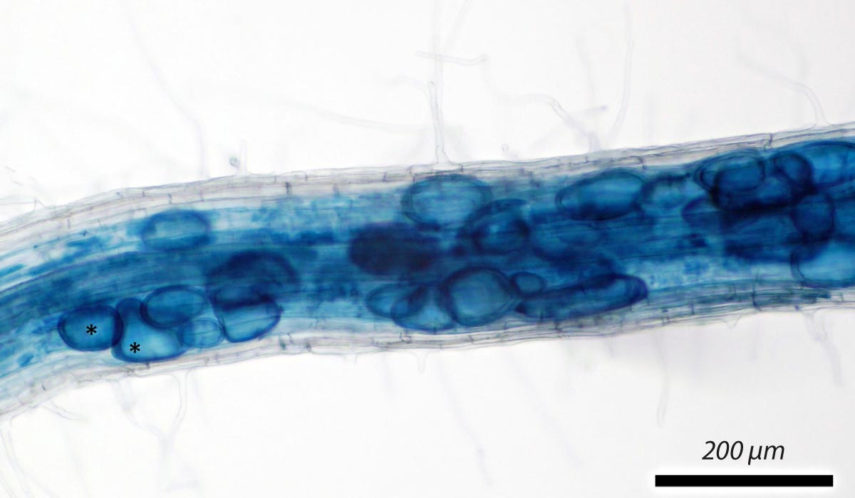 Obr. 5: Kolonizace kořene arbuskulární mykorhizní houbou; úsečka značí 200 μm, hvězdičkou jsou označeny útvary mykorhizní houby zvané vezikuly, barveno trypanovou modří