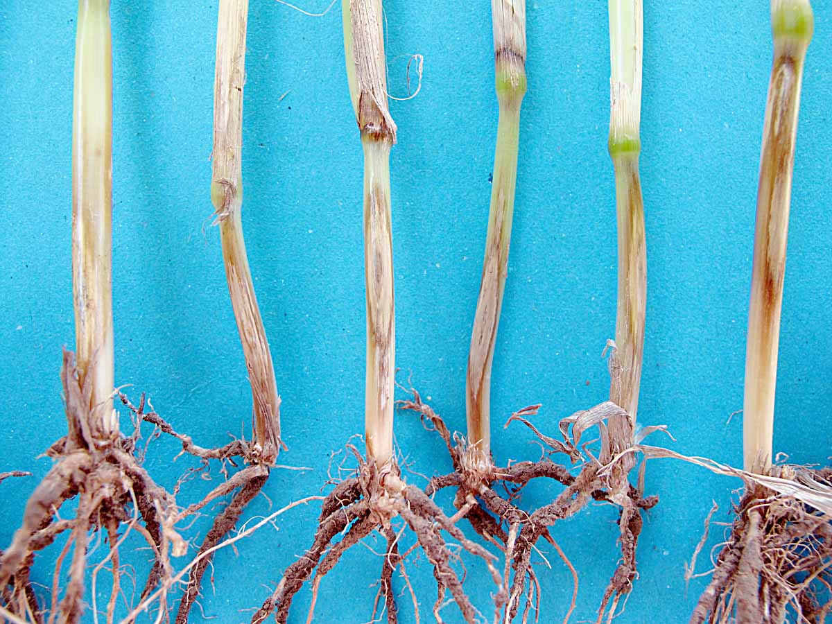 Obr. 6: Báze rostlin pšenice napadené stéblolamem (Oculimacula spp.).