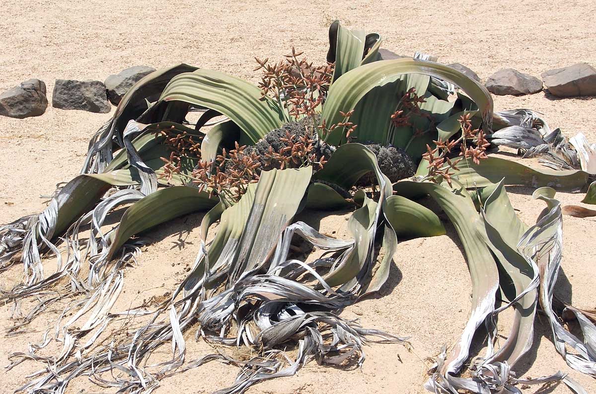 Obr. 1: Welwitschie podivná - model extrémní odolnosti vůči suchu; je to endemit, rostlina která se nachází se pouze v extrémním ekosystému, jako je poušť Namib v Namibii, a také v Angole a v jižní Africe, je to nahosemenná rostlina, dosahuje stáří 500 až 600 let, roste v oblastech, kde spadne pouhých 20–120 mm srážek za rok, přežije i 5 let bez deště a vodu dokáže získat i z rosy a z mlhy (wikipedia.org)
