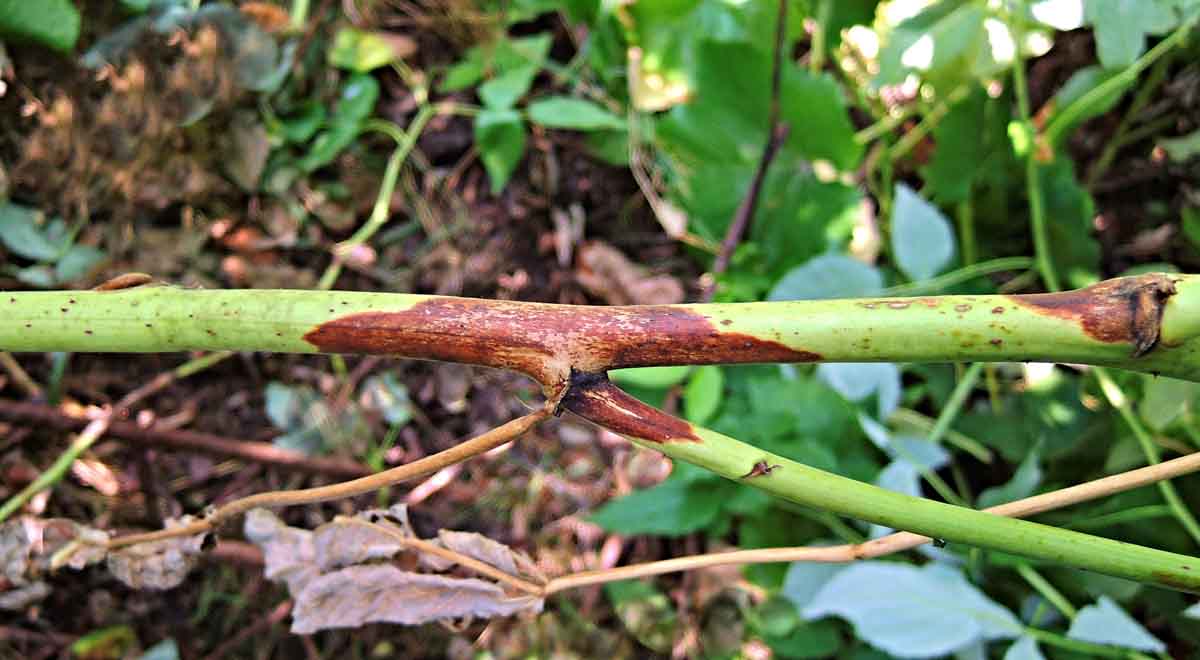 Tato choroba se vyskytuje především na těžkých a vlhkých půdách a ve starších a zahuštěných (zastíněných) výsadbách. Napadá listy a zejména mladé výhony (letorosty), na jejichž bázi se objevují fialově hnědé různě ohraničené skvrny. Náchylnost jednotlivých odrůd je rozdílná. Napadené výhony mají v příštím roce menší přírůstky a za příznivého počasí pro rozvoj houby letorosty předčasně, často již na začátku sklizně zasychají a mohou se i vylamovat.