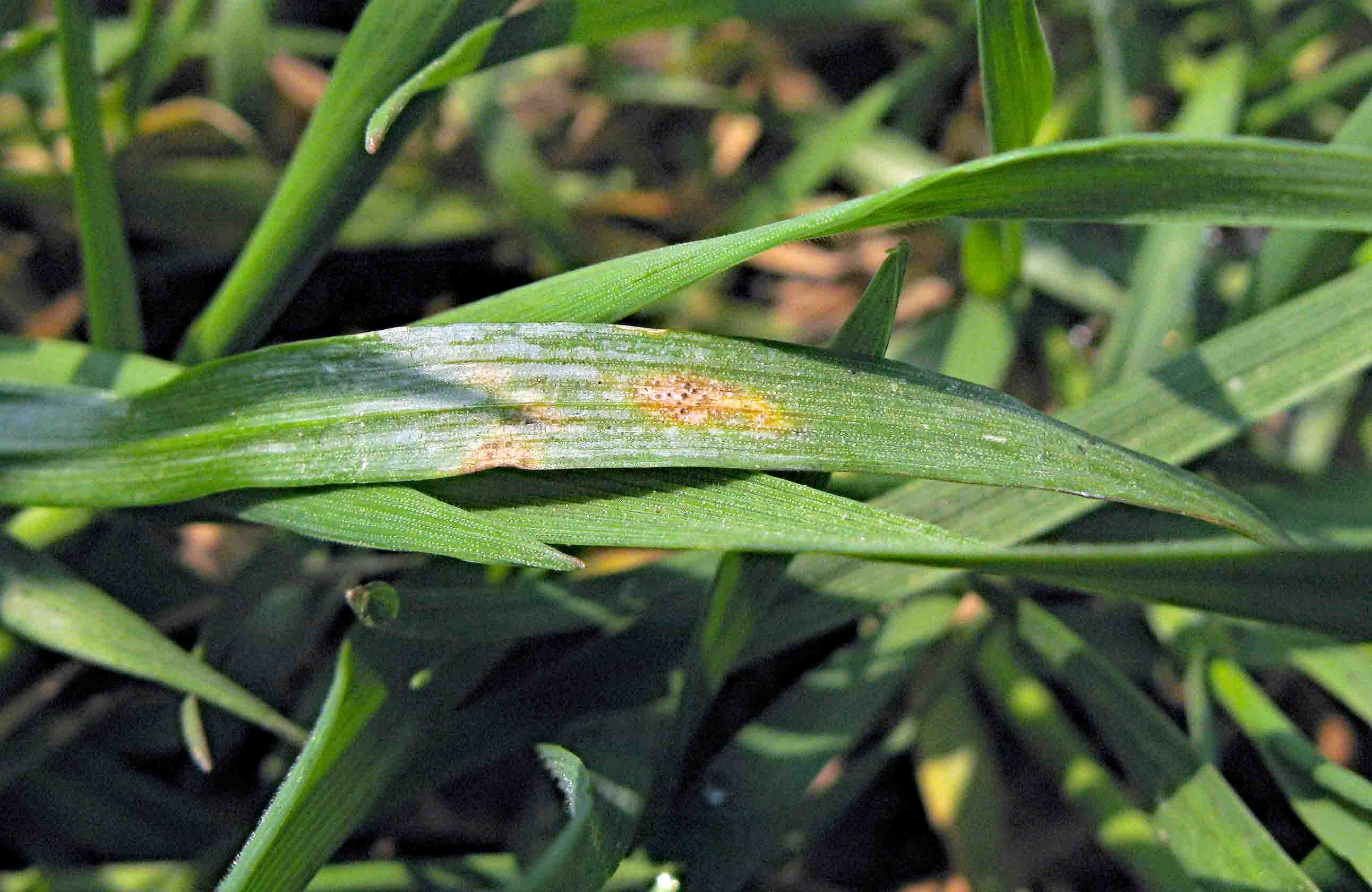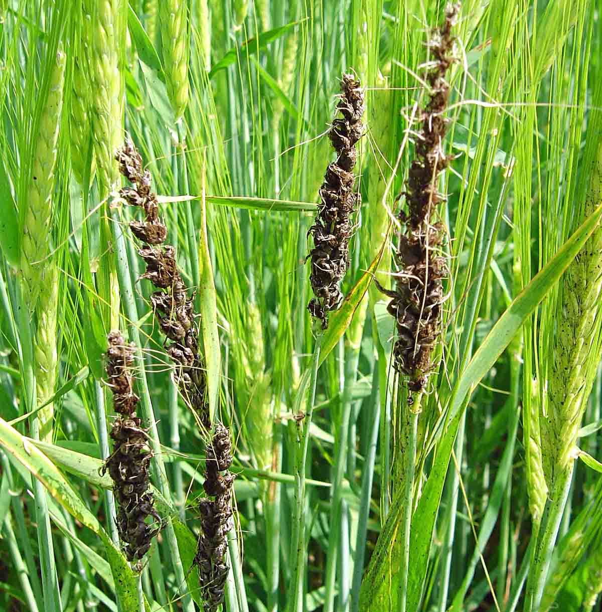 Choroby ozimé pšenice - Výskyt chorob pat stébel byl na jaře slabý (zejména u ozimé pšenice a ozimého ječmene po obilninách) a ošetření se provádělo jen výjimečně. Na jaře se na spodních listech pšenic lokálně rozšířila primární infekce braničnatky pšeničné. Citlivé odrůdy (zejména ve vyšších oblastech) byly středně až silně napadeny padlím pšenice. Po oteplení se u citlivých odrůd projevilo i napadení helmintosporiovou skvrnitostí (DTR). Některé porosty byly popáleny DAMem, ale poškození rychle odrostlo. Podobně jako u dalších obilnin byl rozvoj chorob tlumen srážkově podprůměrným průběhem počasí. I u hustých zapojených porostů se ani v průběhu metání jak napadení padlím, tak i listovými skvrnitostmi dále nerozvíjelo a zůstávalo jen ve spodních patrech. Po silném oteplení v červnu se rozvoj listových chorob skoro zastavil. Napadení rzí plevovou se místně objevilo u neošetřených porostů na citlivých odrůdách až při dozrávání. Výskyt snětí v klasech byl jen minimální.