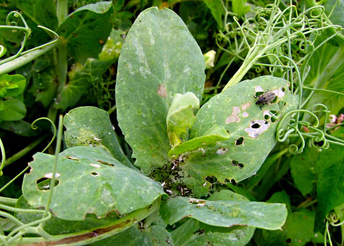 Na vzcházejících rostlinách byly místy slabé výskyty listopasů rodu Sitona. Vlivem dobrých podmínek pro vzcházení nebyly vzcházející porosty významněji poškozeny. Byly zjištěny střední až silné výskyty kyjatky hrachové a místy i třásněnek. Napadené porosty byly ošetřeny.