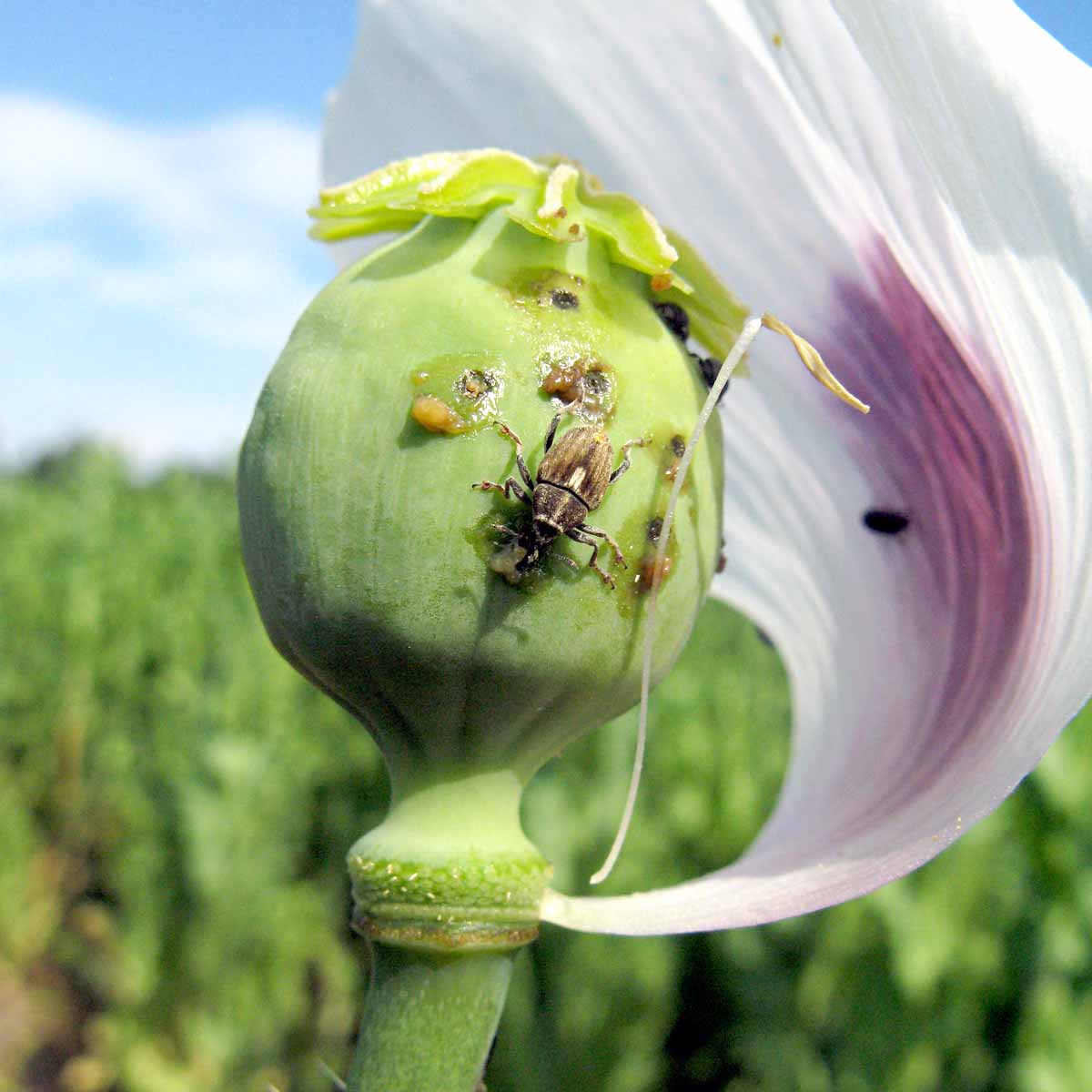 Škůdci - Rovněž u máku již nemohlo být letos osivo insekticidně ošetřeno a přesto poškození vzcházejících porostů pro slabý výskyt krytonosce kořenového bylo jen minimální. Porosty byly lokálně středně až silně napadeny mšicí makovou a při dokvétání místy slabě až středně krytonoscem makovicovým. Napadené plochy byly insekticidně ošetřeny.