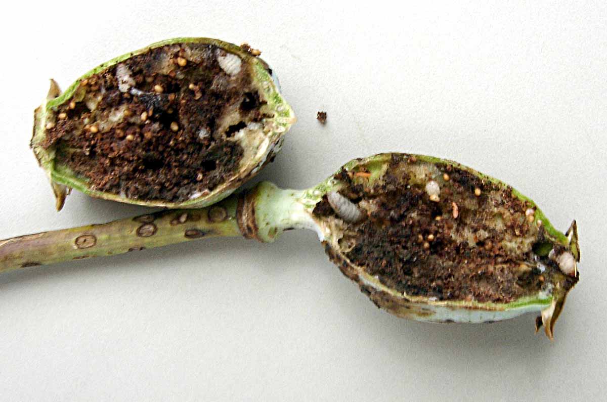 Choroby - Výskyt plísně máku byl většinou slabý lokálně až střední. S postupným sekundárním zaplevelením a přeháňkovým počasím lokálně narůstalo i napadení pleosporovou (hnědou) skvrnitostí máku.