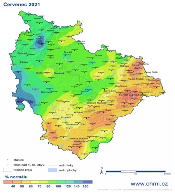 Červenec 2021 byl ve střední Moravě s odchylkou teploty vzduchu od dlouhodobého průměru 1981–2010 +1,8 °C hodnocen jako teplotně nadnormální. Srážkově byl měsíc celkově sice hodnocen jako normální, ale v důsledku bouřek a lokálně intenzivních srážek byly srážkové úhrny velice nerovnoměrné. Stanice v Jeseníkách a okolí zaznamenaly i více než 160 % normálu. Naopak v Beskydech a okolí nenapršelo za měsíc červenec ani 40 % srážkového normálu (např. Lysá hora, Karviná, Těrlicko). Také ve Zlínském kraji byl měsíc srážkově podnormální.