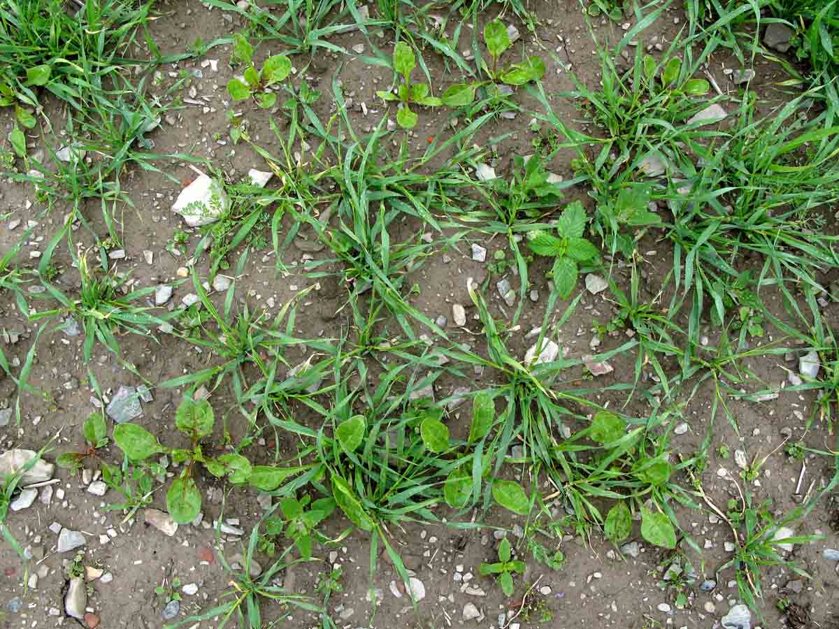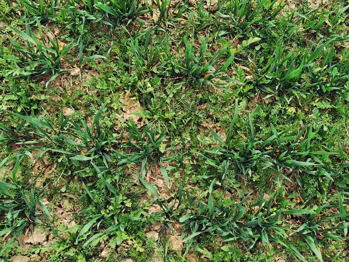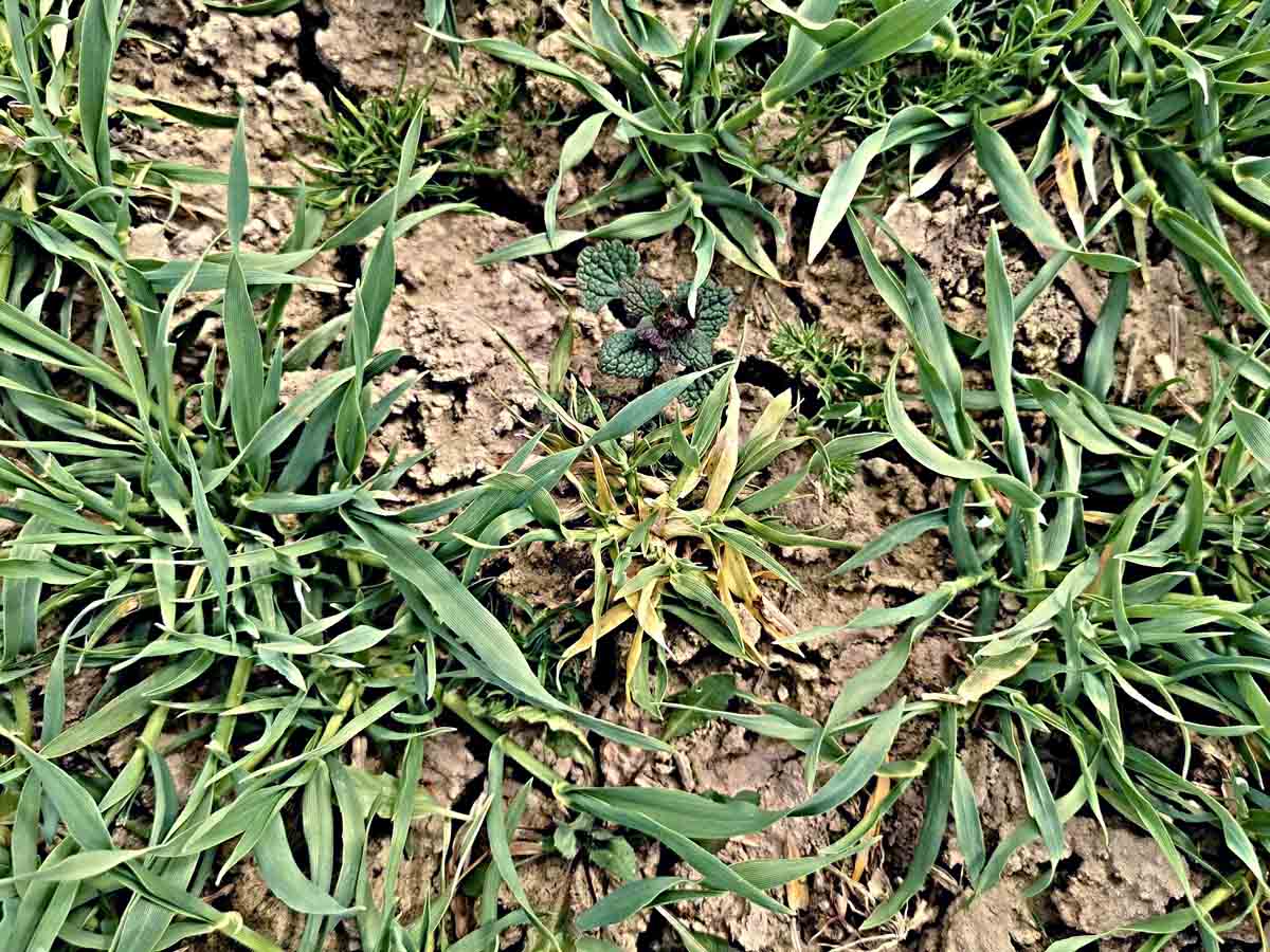 Zaplevelený porost pšenice na jaře