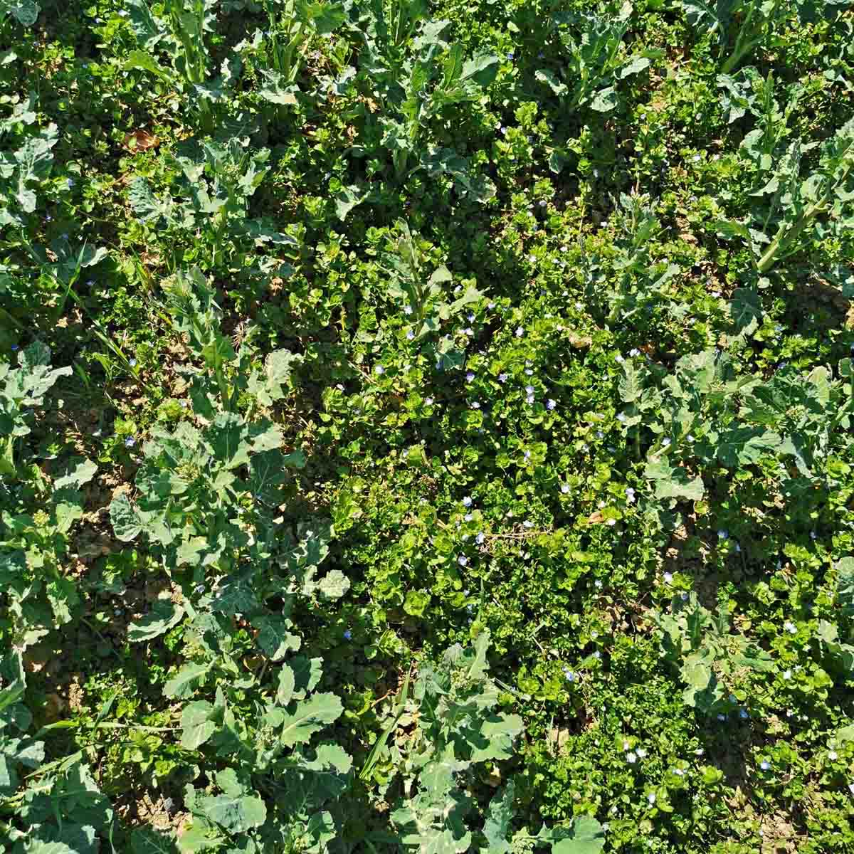Zaplevelený porost řepky ozimé na jaře