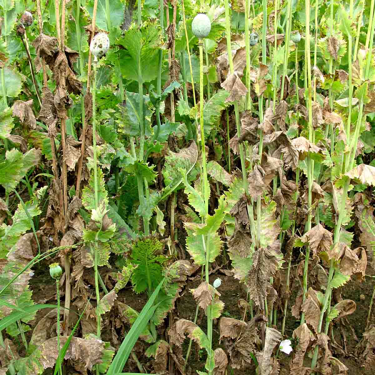 Choroby a škůdci - Výskyt plísně máku byl většinou slabý místy až střední. S postupným sekundárním zaplevelením a přeháňkovým počasím lokálně narůstalo i napadení pleosporovou hnědou skvrnitostí máku. Vzcházející porosty máku byly krytonoscem kořenovým poškozeny jen minimálně. Lokálně byly středně napadeny mšicí makovou a při květu místy i krytonoscem makovicovým. Většina napadených ploch byla včas ošetřena insekticidy i fungicidy.
