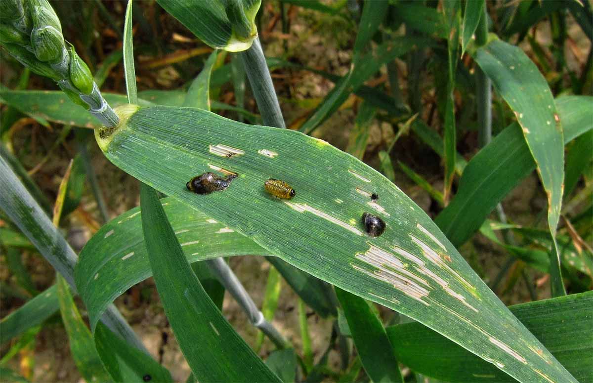 Larvy kohoutka na listu pšenice