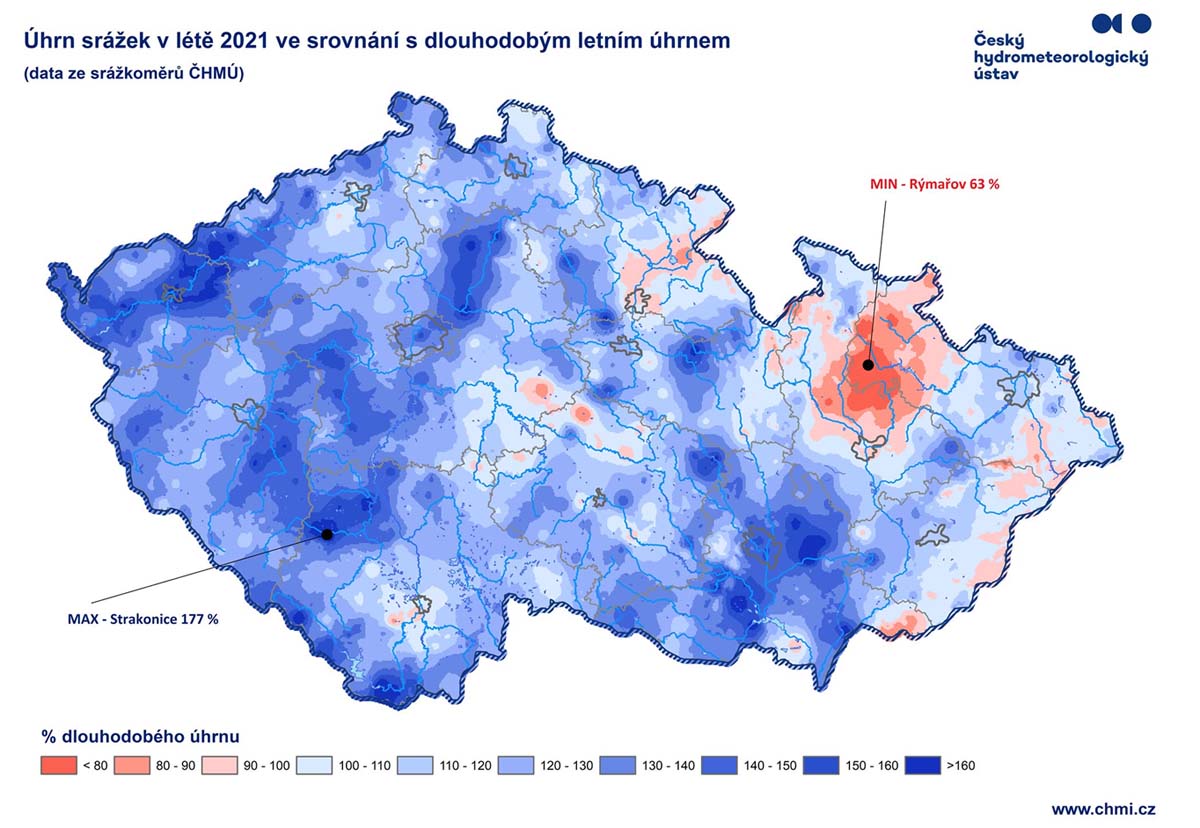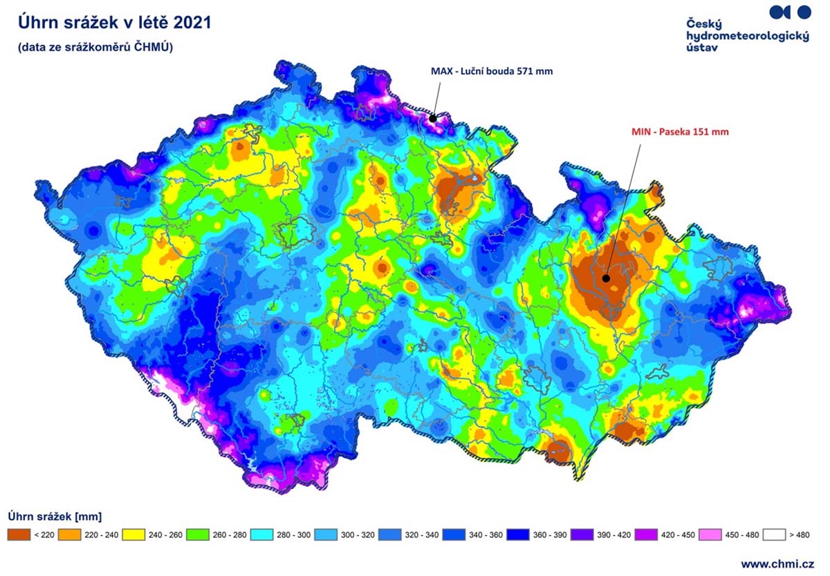 Léto od června až po srpen 2021 bylo mírně teplejší jako loni (2020) s průměrnou teplotou 17,9 °C, to bylo 10. až 11. léto od roku 1961, s 31 tropickými dny jako loni. Ale bylo dle průměrné sezónní teploty o poznání chladnější než tři léta předchozí (2017 - 18,5 °C, 2018 - 19,3 °C, 2019 - 19,5 °C). Červen byl teplotně hodnocen jako silně nadnormální. Červenec byl hodnocen jako normální a srpen jako by chtěl vyrovnat horký červen, byl hodnocen jako teplotně podnormální. Letos v létě napršelo průměrně 300 mm srážek a to je 121% normálu 1981-2010 a bylo to o 22 mm méně jako loni. Ale byly velké rozdíly v úhrnu srážek mezi jednotlivými oblastmi.