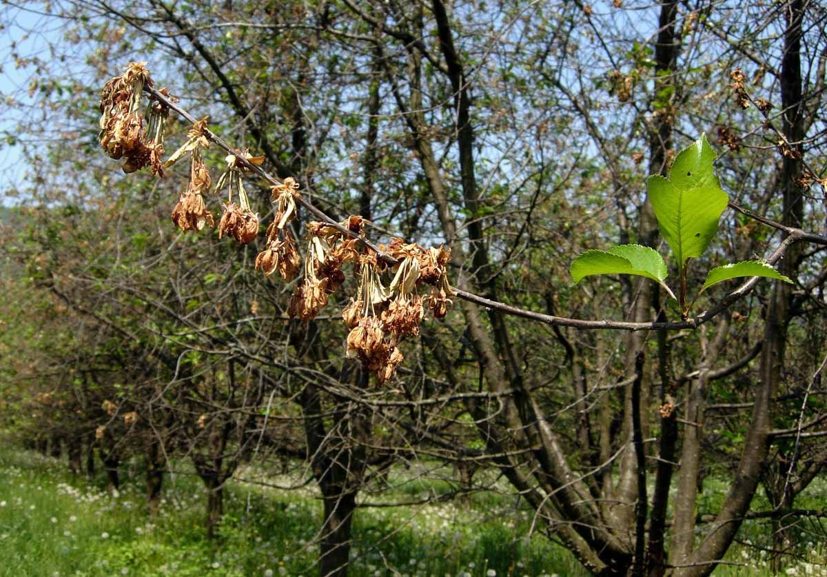 V intenzívně pěstovaných sadech převládaly slabé až střední výskyty škodlivých organizmů. Střední až silnější výskyty byly zjišťovány zejména na neošetřovaných stromech extenzivních sadů a stromořadí. Poslední dubnová dekáda přinesla výrazné ochlazení s výskytem mrazů, které na řadě míst způsobily škody. Letos důsledkem mimořádně teplého února a časným nástupem vegeace dubnové mrazy poškodily již odkvetlé a rozkvetlé stromy, které by při běžném průběhu počasí ještě nekvetly. Lokálně byl silně poškozen angrešt, rybíz, broskve, meruňky, ořešáky, réva vinná i hrušně, meruňky a další.