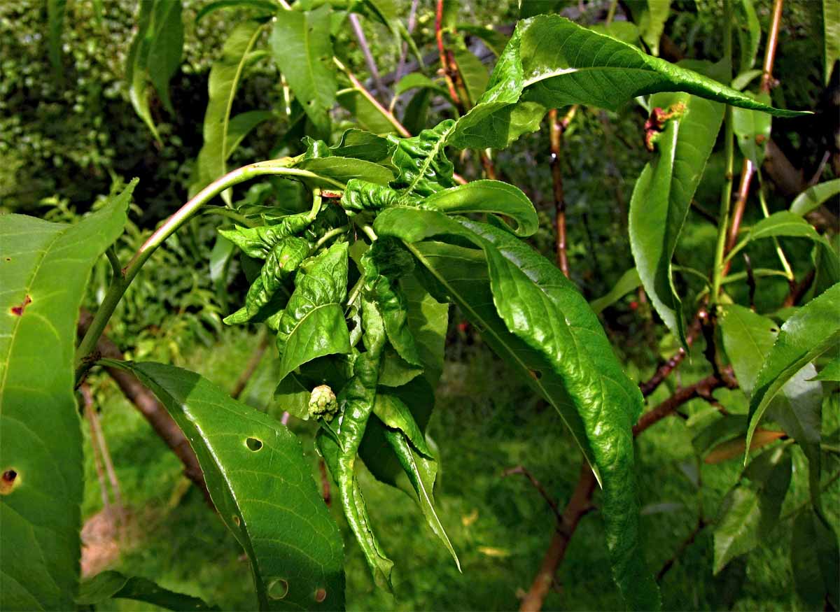 Svinování listů broskvoně působením mšice hnízdotvorné