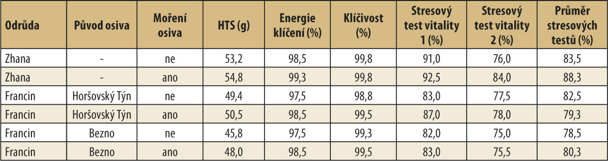 U vysévaného osiva jarního ječmene byly mezi porovnávanými variantami zjištěny rozdílné výsledky (tab. 1). Moření osiva neovlivňovalo rychlost klíčení ani laboratorní klíčivost, která u všech porovnávaných vzorků dosahovala velmi vysoké úrovně, ale mělo kladný vliv na laboratorní vzcházivost zjišťovanou ve dvou stresových testech. HTS byla u mořených variant v porovnání s nemořenými mírně zvýšená. Z odrůd měla vyšší HTS Zhana než Francin.
