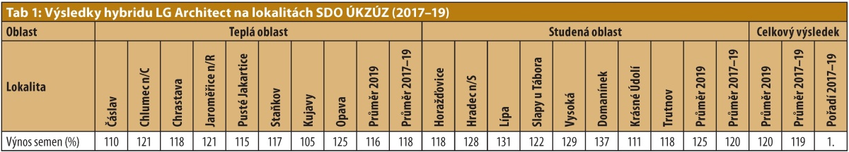 LG Architect je testován v našich podmínkách už od roku 2016. Nehovoříme o lecjakých testech, ale o regulérním zkoušení v rámci registračních a postregistračních zkoušek ÚKZÚZ. Za tu dobu byl na lokalitách ÚKZÚZ testován 36× vždy ve 3 opakováních (graf 1). LG Architectt měl ve 35 případech vyšší výnos než průměr kontrol. To je velmi robustní výsledek. Ještě jeden oficiální výsledek hovoří jasně ve prospěch hybridu LG Architect. Tím jsou výsledky zkoušení pro Seznam doporučených odrůd (tab. 1). Provádí je opět ÚKZÚZ, ale sada výsledků je doplněna o více lokalit, určující je údaj za více ročníků. Současným králem SDO pokusů 2017–19 je LG Architect s výnosem 119 % na průměr, má vyrovnaný výkon v teplé (118 %) a v chladné (120 %) oblasti. Vysoký výnos dosahovaný pravidelně na drtivé většině lokalit v různých klimatických podmínkách je objektivním doporučením zařadit hybrid LG Architect do osevního plánu na podnicích v celé České republice.