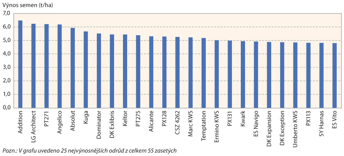 Výnosové výsledky (graf 1) u odrůd Addition, LG Architect a Angelico korespondují s výbornou polní vzcházivostí. Tyto odrůdy dosáhly nejlepšího výnosu (Addition - 6,48 t/ha, LG Architect 6,24 t/ha, Angelico - 6,18 t/ha). Nadprůměrného výnosu dosáhly také odrůdy PT271, Absolut, Kuga, Dominator, DK Exlibris, Keltor a PT275.