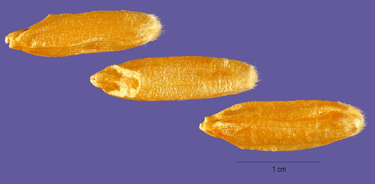 Komentář: Morfologické znaky byly hodnoceny podle klasifikátoru pro rod Triticum L. (Praha, 1985). Kamut® vytváří velmi vzpřímený trs, stéblo na počátku metání hodnocené jako silně až velmi silně ojíněné a vyplněné v horním internodiu dorůstá do výšky stupně 4 (nízká až střední). Praporcový list je krátký a velmi úzký, jeho postavení na počátku metání je vzpřímené, druhý horní list náleží do stejné velikostní kategorie. Ve fázi plné zralosti má Kamut® jehlancovitě-hranolovitý a osinatý klas (2), podlouhle oválná pleva s ostrým zakončením zubu je žlutá, ochmýřená, osina je částečně černá. Velmi velké zrno (HTS 64 g) je žluté barvy. Sklovitá obilka je velmi podlouhlá, někdy slabě svraštělá, se střední úzkou rýhou. Z hlediska zdravotního stavu je tato pšenice poměrně náchylná k Erysiphe graminis D.C., Puccinia graminis PERS. subsp. graminis i Puccinia striiformis WEST. Je středně odolná vůči poléhání (6). Zrno Kamutu je sklovité, obsahuje 18,9 % bílkovin, 10 % mokrého lepku, gluten index je 91 % a SDS 2,8 ml. Zdroj: VÚRV Praha-Ruzyně, Genová banka |