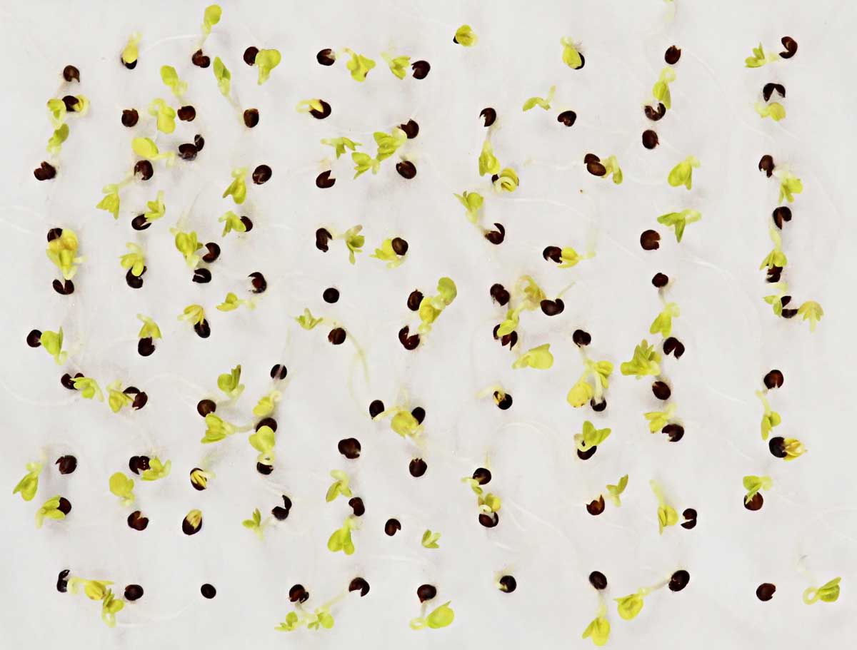 Porost řepky ozimé z neošetřeného (levá část snímku) a osiva ošetřeného nízkotlakým mikrovlnným plazmovým výbojem (pravá část snímku); porost z ošetřeného osiva je rychlejší ve vývoji - již ve fázi odkvětu