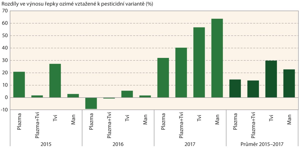 Dosažené výnosy poloprovozního pokusu jsou přehledně shrnuty v tabulce a grafu. V provozním pokusu bylo u varianty plazma dosaženo výnosu 3,19 t/ha a u pesticidní varianty 2,82 t/ha, tj. plazmové ošetření navýšilo výnos semen o 13 %.
