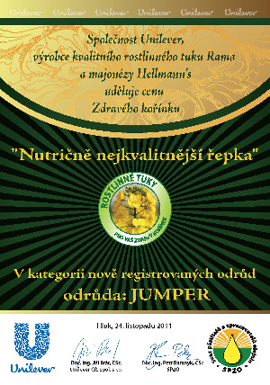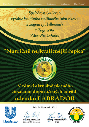 Odborná komise během slavnostního vyhlášení na vyhodnocovacím semináři Systému výroby řepky, který se konal, 24. listopadu 2011 v Hluku, udělila ocenění „Nutričně nejkvalitnější řepka roku 2011“ dvěma odrůdám řepky olejky - Labrador a novince Jumper.