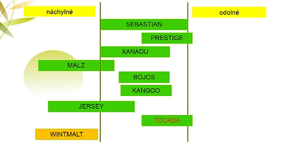 Volba odrůdy je dána především požadavky zpracovatele, pro kterého budoucí produkci pěstujeme. Preferovanými odrůdami pro sladovny SOUFFLET ze sklizně 2011 budou odrůdy jarního ječmene SEBASTIAN, PRESTIGE, BOJOS, MALZ, XANADU, KANGOO a JERSEY a dále ozimá odrůda WINTMALT. Při vlastním výběru odrůdy bychom měli vzít v úvahu do jaké míry je odrůda plastická a zda se hodí do našich půdně klimatických podmínek. Firma SOUFFLET AGRO a.s. zakládá každoročně ve všech nejdůležitějších pěstitelských oblastech jarního ječmene odrůdové maloparcelkové pokusy. Zde porovnáváme celou řadu odrůd pěstovaných jak u nás tak v zahraničí včetně novošlechtění s cílem porovnat jejich pěstitelské vlastnosti pro jak po výnosové, zdravotní tak i kvalitativní stránce. Na základě víceletých výsledků lze z pohledu výnosu předního zrna (>2,5 mm) do KVO doporučit především odrůdy KANGOO, BOJOS, XANADU, ale i MALZ a PRESTIGE; do ŘVO pak KANGOO, SEBASTIAN, XANADU a MALZ; do OVO SEBASTIAN, KANGOO, XANADU, BOJOS, MALZ i PRESTIGE. Výsledky preferovaných odrůd jsou v tabulkách 1 a 2 doplněné o výsledky vysoce výkonné krmné odrůdy TOCADA.
