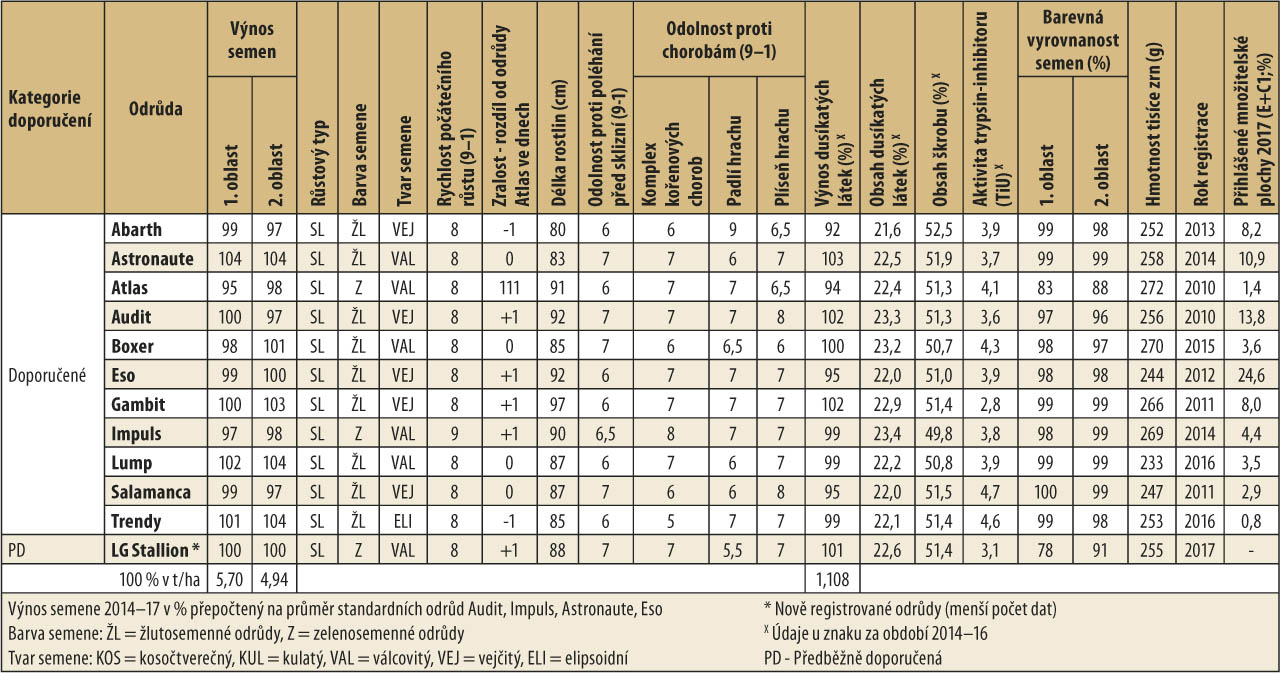 Seznam doporučených odrůd hrachu polního pro zásev 2018 obsahuje celkem 12 semi-leafless odrůd, z čehož je 9 žlutosemenných a 3 zelenosemenné odrůdy. Nově byla do seznamu zařazena předběžně doporučená zelenosemenná odrůda LG Stallion vyznačující se středně vysokou odolností proti poléhání před sklizní.