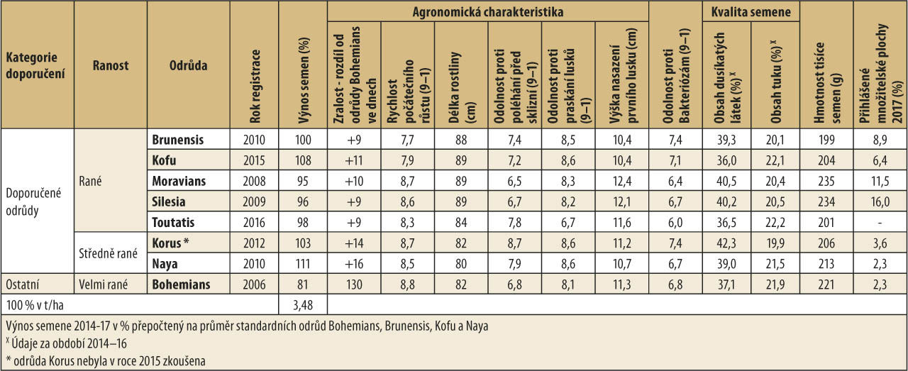Seznam doporučených odrůd sóje pro zásev 2018 obsahuje 8 odrůd rozdělených podle doby do zralosti do tří ranostních kategorií - odrůdy velmi rané, rané a středně rané. Ustupující velmi raná odrůda Bohemians byla zařazena do kategorie ostatních odrůd.